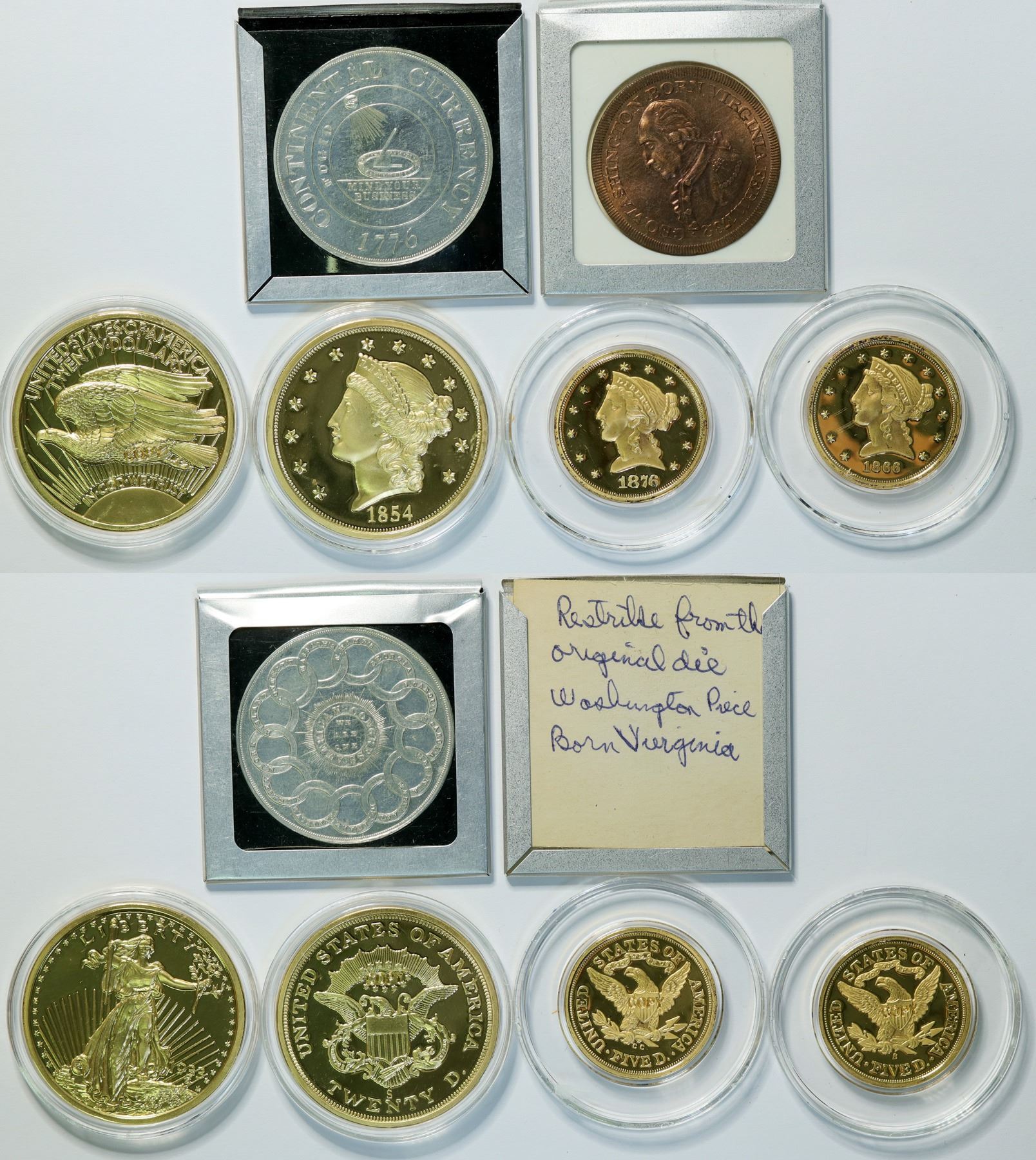 Lot of six "copy" coins: 1876-CC $5 ; 1866-S $5; Geo. Washington "Born Virginia" medal; Continental dollar; 1933 St. Gaudins $20; 1854-S $20.
