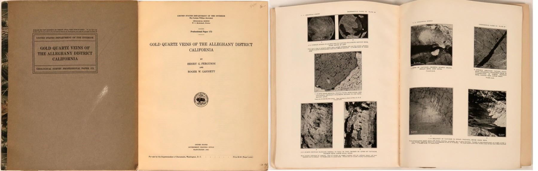 Gold Quartz Veins of teh Alleghany District, California, 1932 U.S. G.S. PP 172 By H. G. Ferguson & R. W. Gannett. 9 x 11.5" softbound booklet, 58 plates, 5 in pocket, 46 figures, 139 pages. Fine condition, binding has been reinforced.