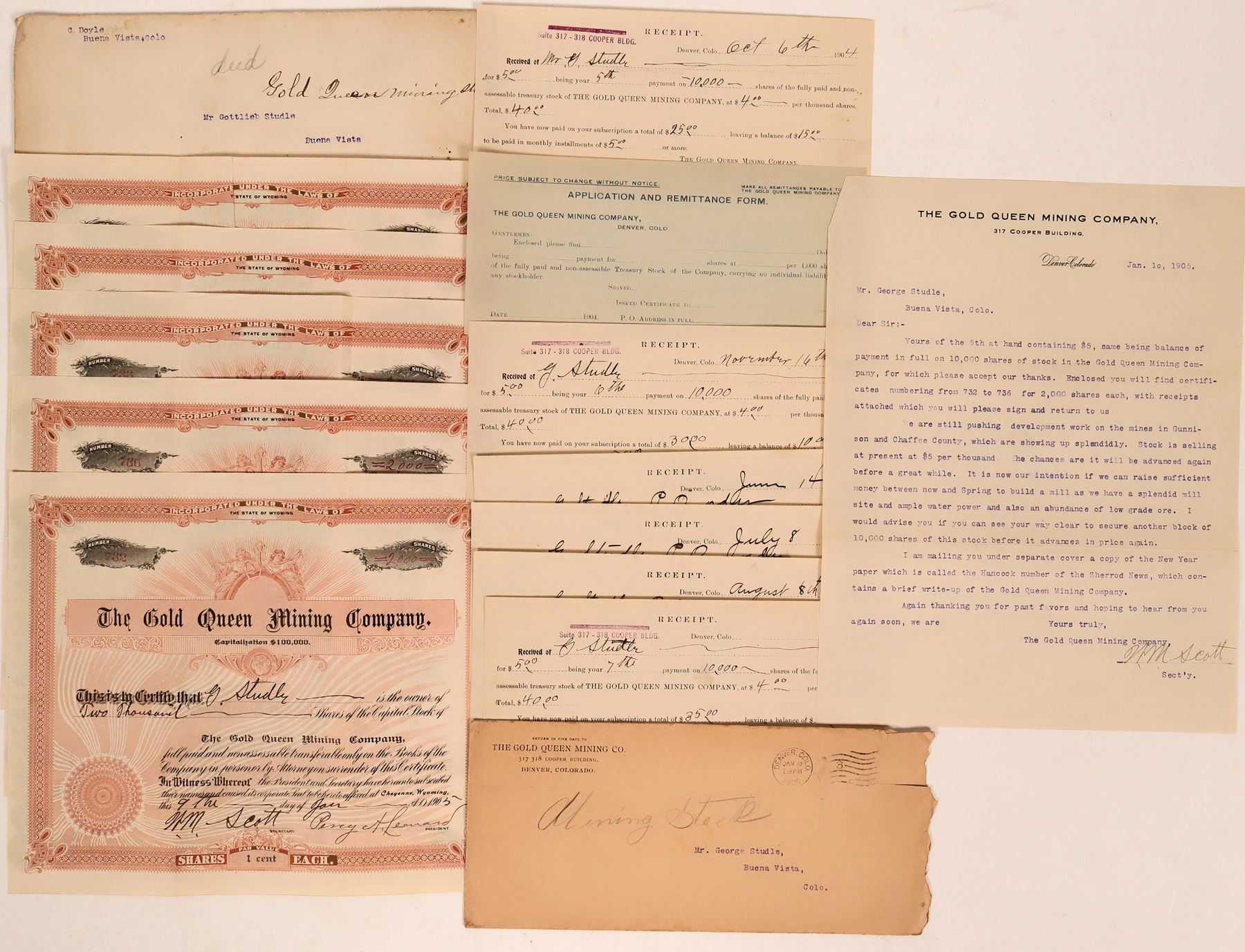 * Five Gold Queen Mining Company stock certificates all issued to G. Studle in 1905 for 2000 shares, uncancelled, signed by Percy Leonard, President and WM Scott, Secretary. Incorporated in Wyoming, datelined Cheyenne. Tri-folded, otherwise very good condition.