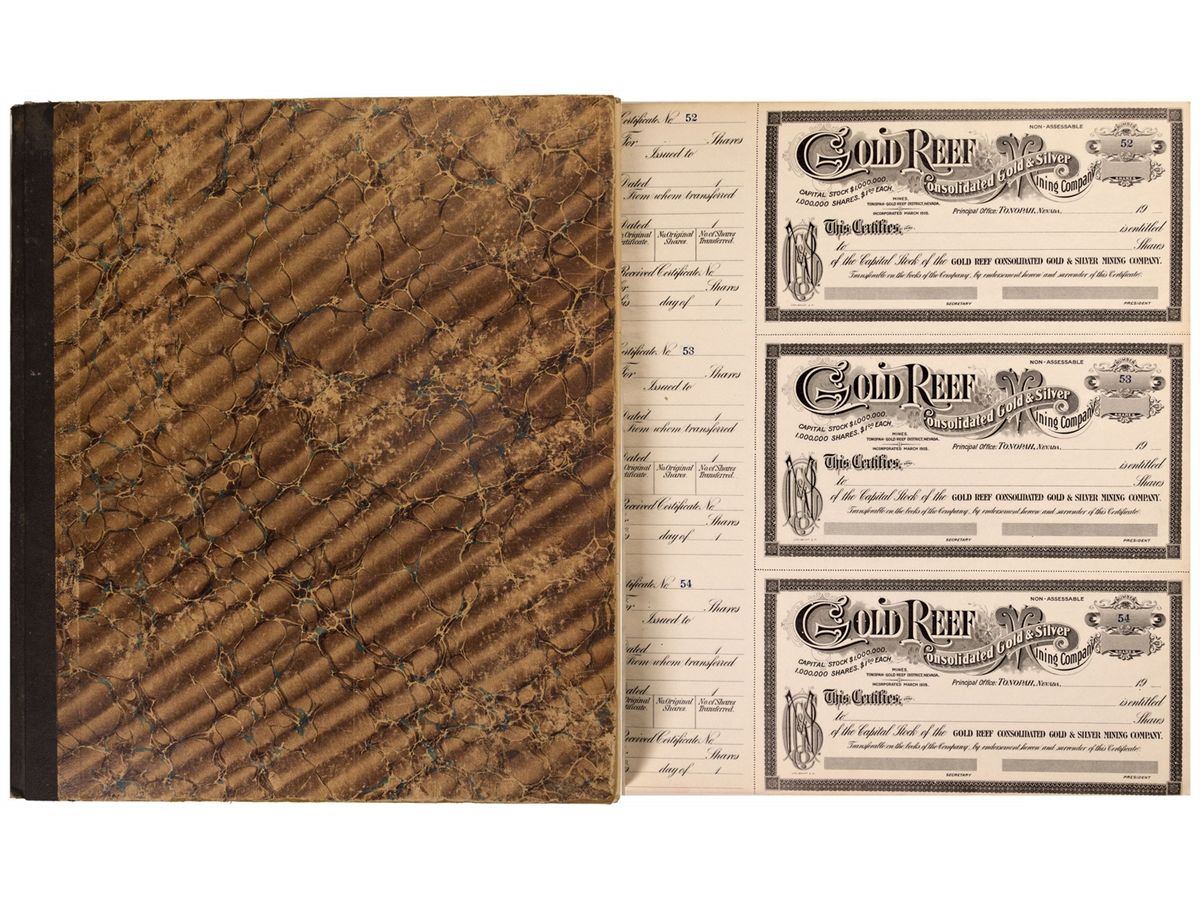 Gold Reef Mining District. Two volumes of unissued stock certificates. The first has stock numbers 43 through to 500. The second has numbers 3100 to 3500 with one extra at the end that has no number. Some of the front matter has been removed in volume one. The stubs start at stock number 10. Number 43 has been written on. All the stocks and stubs are intact in volume two. Volume one is in good condition. Some stocks are yellowing around the edges. The front cover for volume two has water damage in the upper right corner as do some of the stocks. The stocks have some foxing spots on the right edge. Good condition. Both measure 14" x 15.75" and weigh approximately 4 pounds. Date 1905 Tonopah, NV hwac 10007