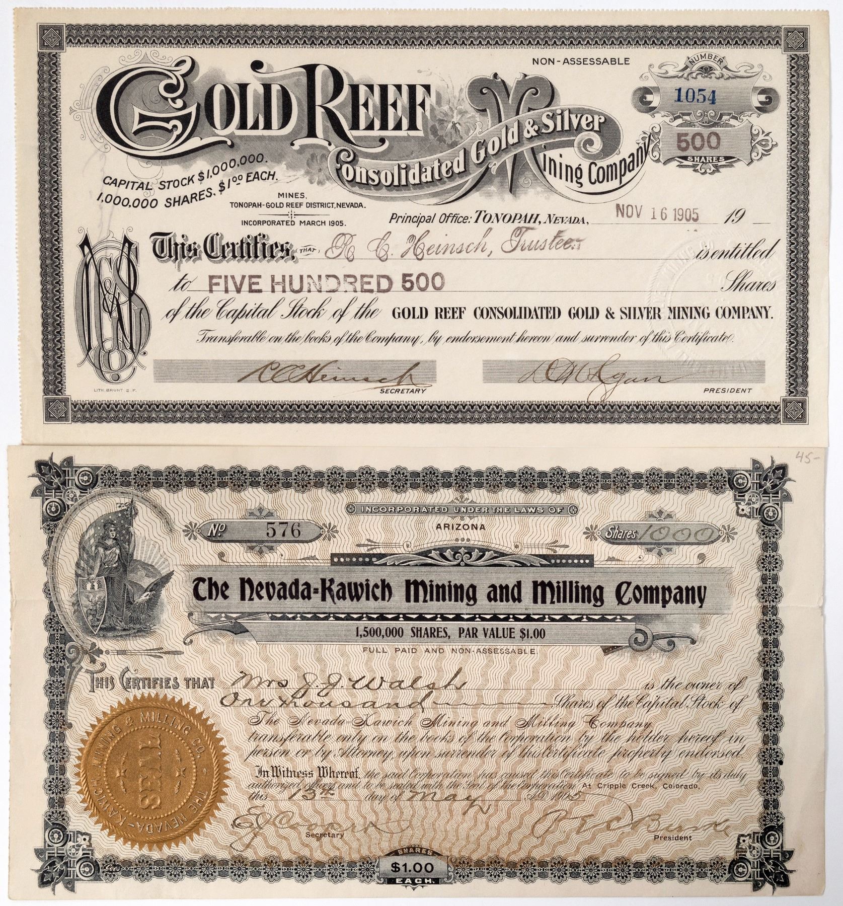 1) Gold Reef Con. #1054 for 500 shares issued to R. C. Heinsch trustee on November 16, 1905. Signed by secretary Heinsch and president D. M. Ryan. Incorporated March of 1905. Tonopah-Gold Reef District. Fancy scrolled title. No corner, edge or discoloration issues. Very nice! This company was short-lived. Located in the Tonopah-Gold Reef district. In 1919 this would become known as the Divide. Ryan was Nevada State Treasurer at the time this was signed. Ryan was also involved in a near death experience on Geiger Grade. 2) Nevada Kawich M&M. # 575 issued for 1,000 shares to Mrs. J. J. Walsh on May 13th, 1905. Signed by P. E. C. Burke (president) and E. J. Cooper (secretary). Vignette of patriotic woman with eagle. Large stain bottom left and deep folds. P. E. C. Burke was the original owner of the C. O. D. mine in Colorado. He located Gold Reed Mining District and the town of Kawich. Biography of Ryan, history of Kawich and notes on the Gold Reef.