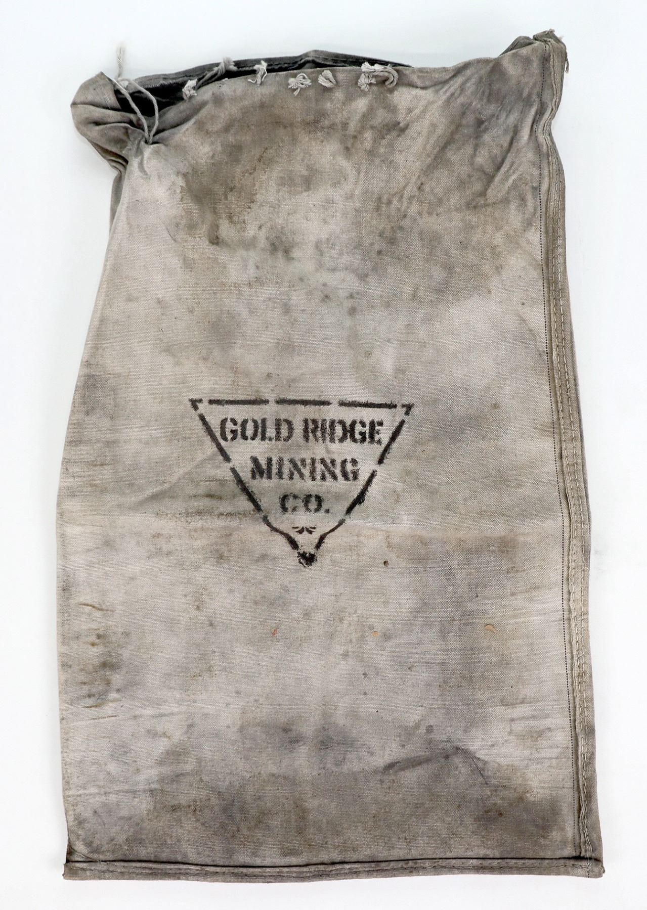Canvas bag measures 13"x 21" and is stenciled Gold Ridge Mining Co. Research found a Gold Ridge Mine in Twain Harte, Tuolumne County, California. Bag is of course, dirty, but still intact. Please see photos for more details.