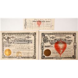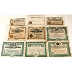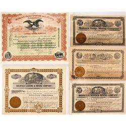 Lot of five mining stocks. 1) Mohawk Ledge. Number 461 for 1000 shares to WD McDonald in 1907. Signed by president Monnette and secretary Showmaker. 2