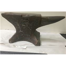 Blacksmith anvil. 18 and half inches long, 9 inches tall, 7 inches wide at the base. It has writing punched on one side: Green/ Green/ Warranted; and