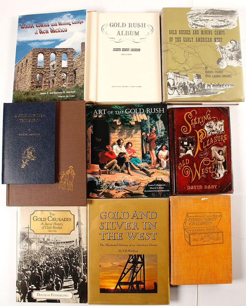 Lot of 10 Gold Rush Books ranging from 1) Ghost Town and Mining Camps of New Mexico (with pictures); 2) Gold Rushes and Mining Camps of the Early American West (hardback) with illustrations and pictures; 3) The Gold Crusades by Fetherling, and 7 more hardback books. (Al Adams Gold Rush Memorabilia Collection) Date: Location: HWAC# 55110