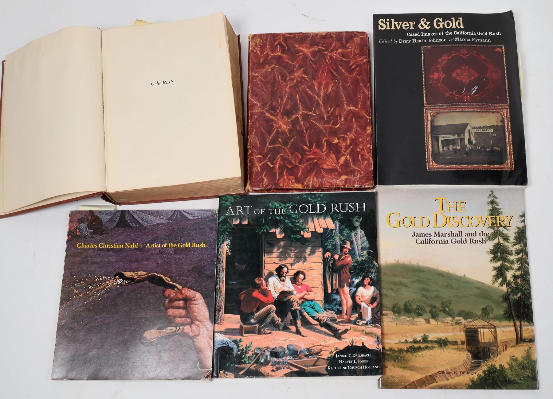 Group of six books related to gold and the Gold Rush. Includes the following titles: Gold Rush: The Journals, Drawings, and Other Papers of J. Goldsborough Bruff (1949), Silver and Gold: Cased Images of the California Gold Rush (1998), the Gold Discovery: James Marshall and the California Gold Rush (1990), Art of the Gold Rush (1998), Charles Christian Nahl: Artist of the Gold Rush (1976), and a League of Nations Gold Delegation Report (c. 1930s). California