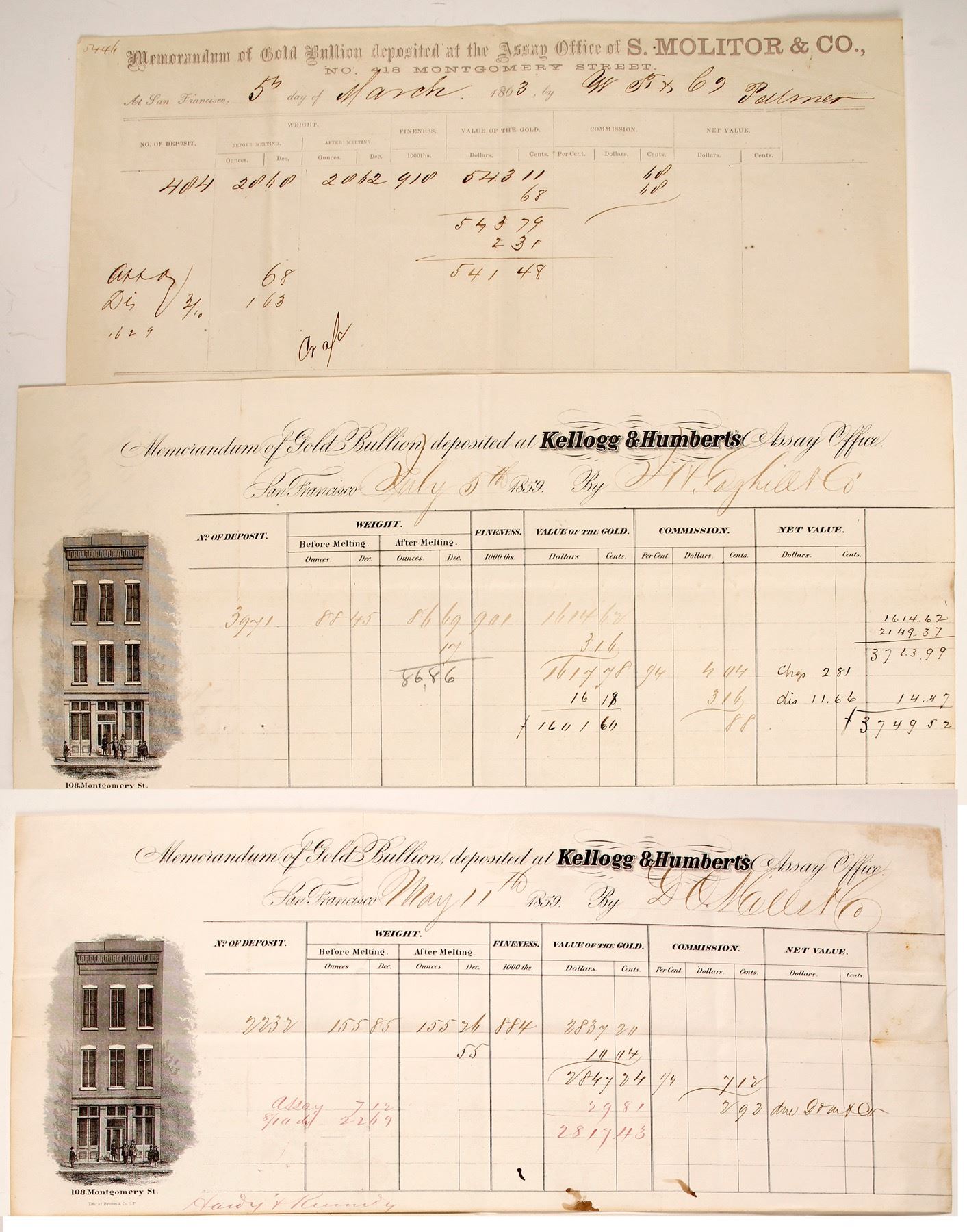 Three gold rush bullion receipts from the assay firms of Kellogg & Humbert (1859) and S. Molitor & Co. (1863). They appear to be from three different locations, CTH PAlmer for Wells Fargo at Folsom, DO Mills of Hardy & Kennedy in Forest Hill, and Coghill possibly of Shasta. State: California City: San Fran Date: