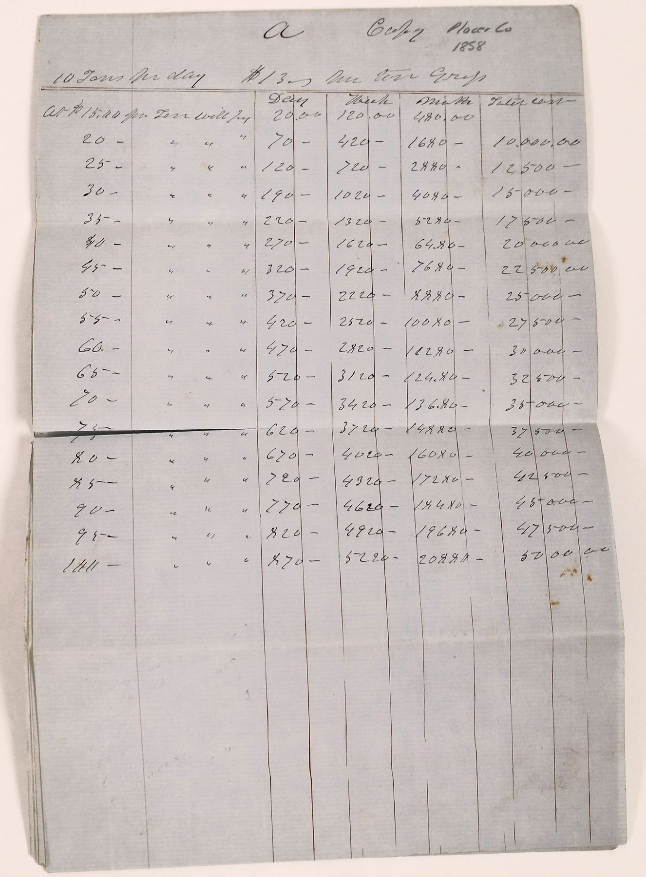 Mines located at American Bar, Middle Fork of the American River, Placer County, CA around Oct. 20th 1857. Breakout of charges for refining ore at 10 tons per day at $13 per ton. 9 pages on folded blue lined paper. The Aurora Gold & Silver Mining Co. approves use of J.A. Bartoler's (? ) mill amalgamating patent for use by the Bay State Quartz Mill Company of American River. Also that they provide J. Chambers or agent with enough quartz from their ledges to process 10 tons per day. The Aurora Gold & Silver Co. was located on the west side or the Sierras. The mill was located at American Bar on the American River and was considered one of the advanced and efficient at the time. It was the first introduced new methods of amalgamating and saving gold. Previously used processes were crude. The innovations made at the Bay State Mill was the adoption of the “Chambers' Process," introduced by Judge Chambers, late of the banking house of Page, Bacon & Co. In this the quartz after being crushed under the stamps was ground still finer by mill-stones, then through amalgamating pans, with chemicals and quicksilver. The chemicals used were a secret to the inventor, and a large royalty was demanded for the use of the process, as it was patented. Much more information! State:California City:American Bar Date:1857 Provenance: