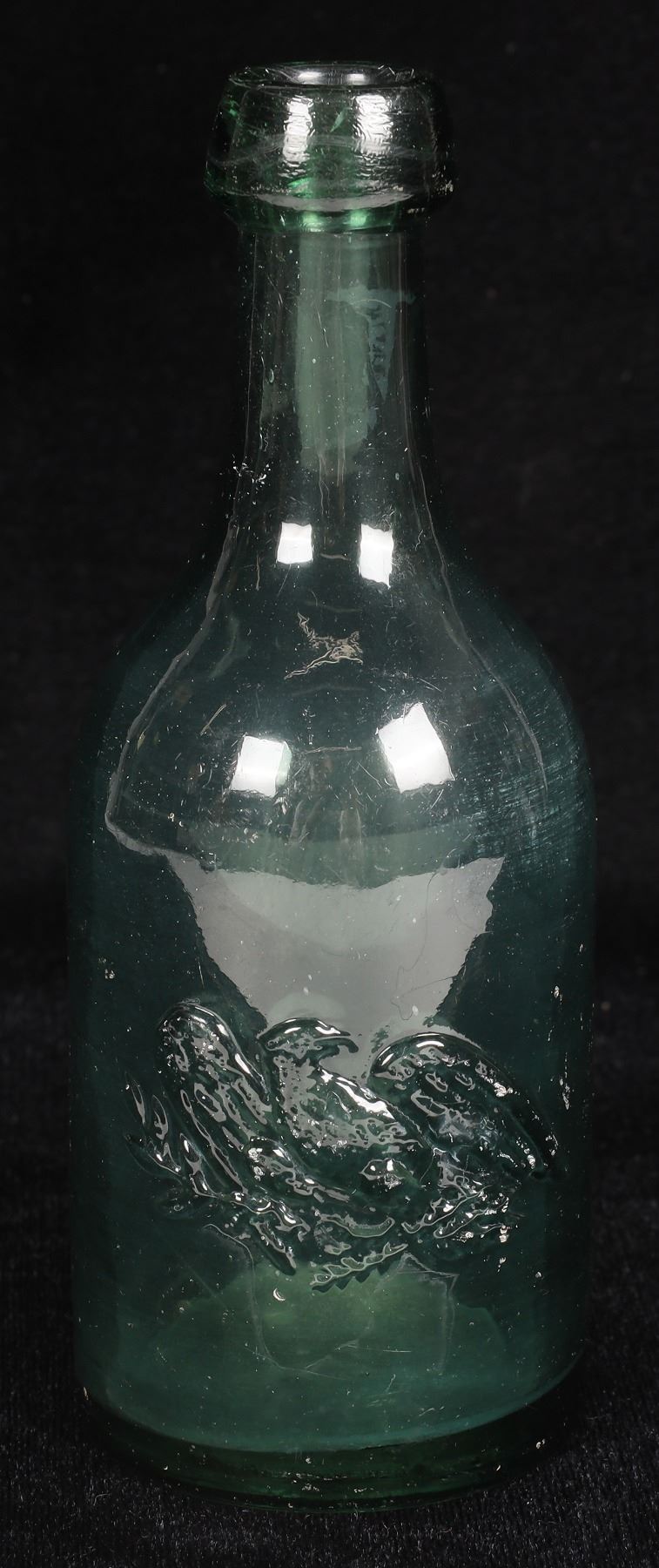 Light green California Gold Rush applied top soda bottle. Embossed eagle, probably Eagle Soda Works, c. 1850's. 7", no apparent chips or cracks. California
