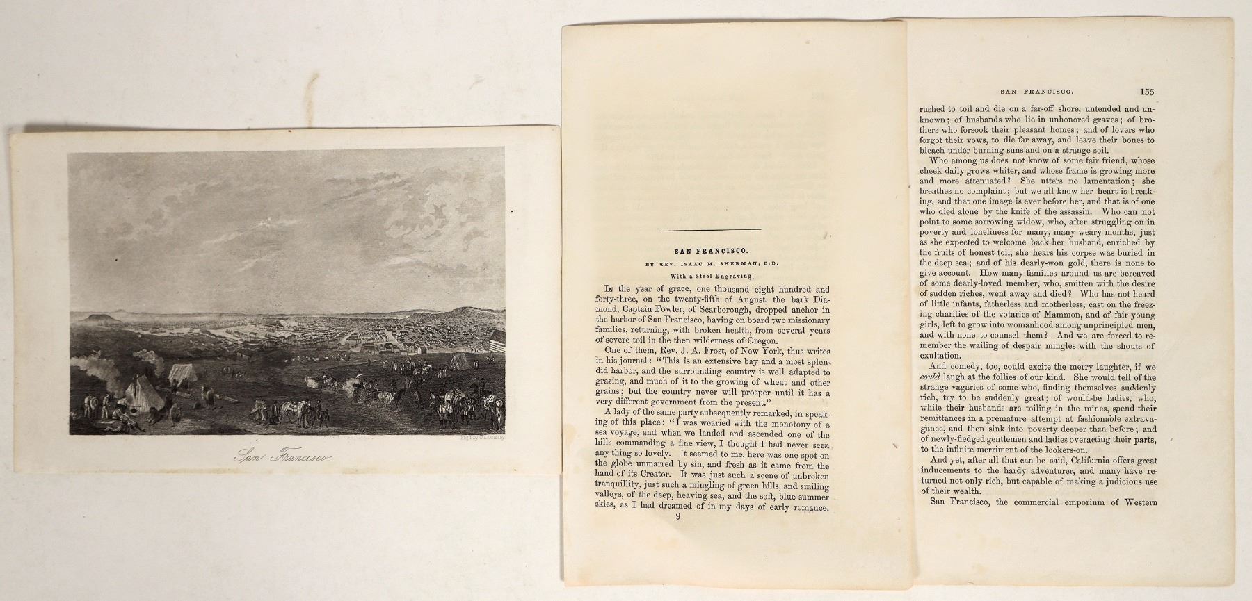 Original engraved view titled "San Francisco" by WL Ormsby, c.1855. 5.5 x 9" Has 4pp. of accompanying text titled "San Francisco" by Rev. Isaac M. Sherman, DD. This is probably an improved version of a wood engraving c.1848. Ormsby was one of the founders of Continental Bank Note Co. He also invented the "grammagraph" used to copy medals and scenes on banknote scenes.