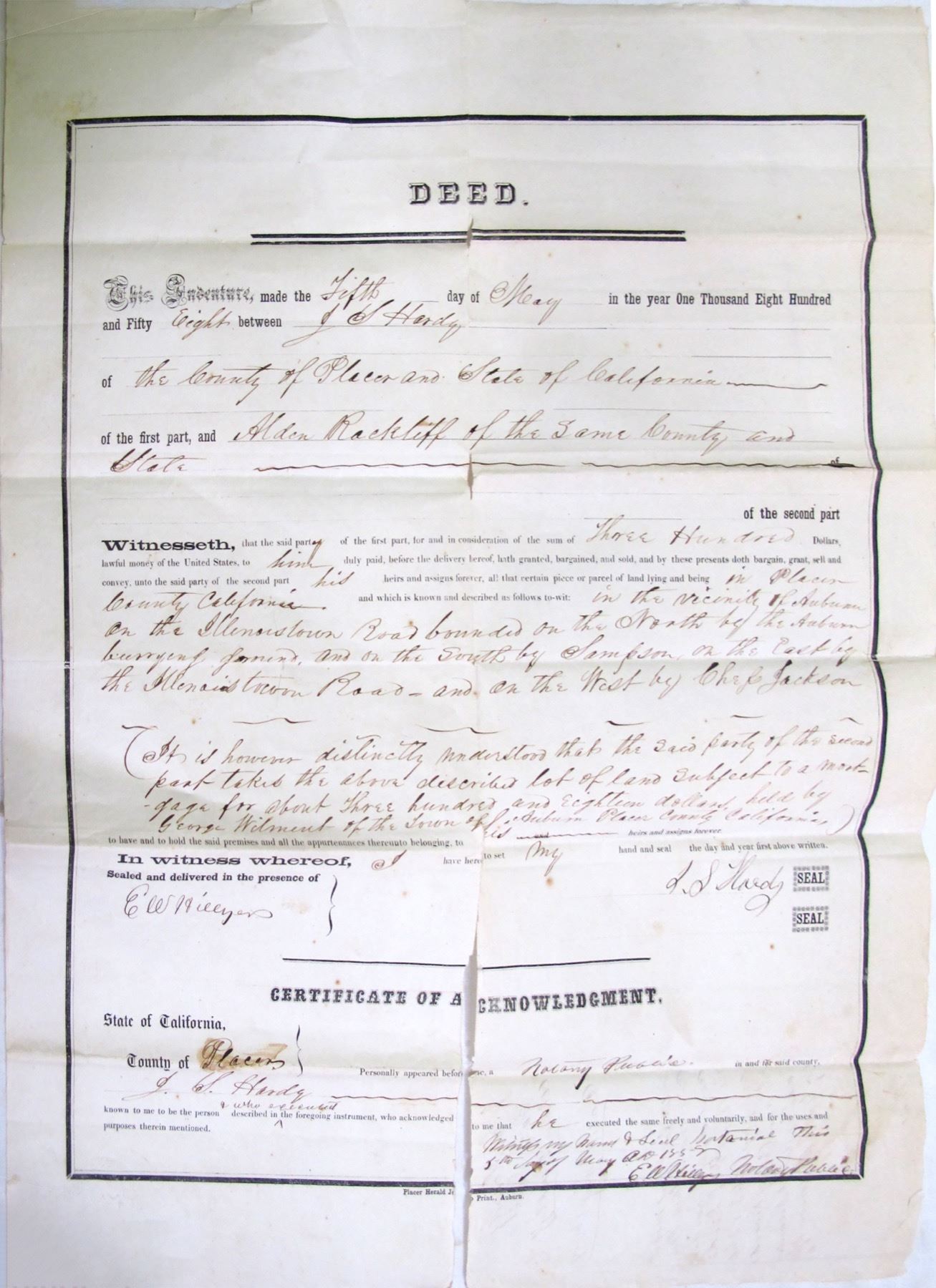 Printed by Placer Herald in Auburn, CA. J Hardy signatures. 21" x 17". Large tear on lower vertical crease and smaller crease tears. Sold as is. State: California City: Auburn Date: 1858 HWAC# 85143