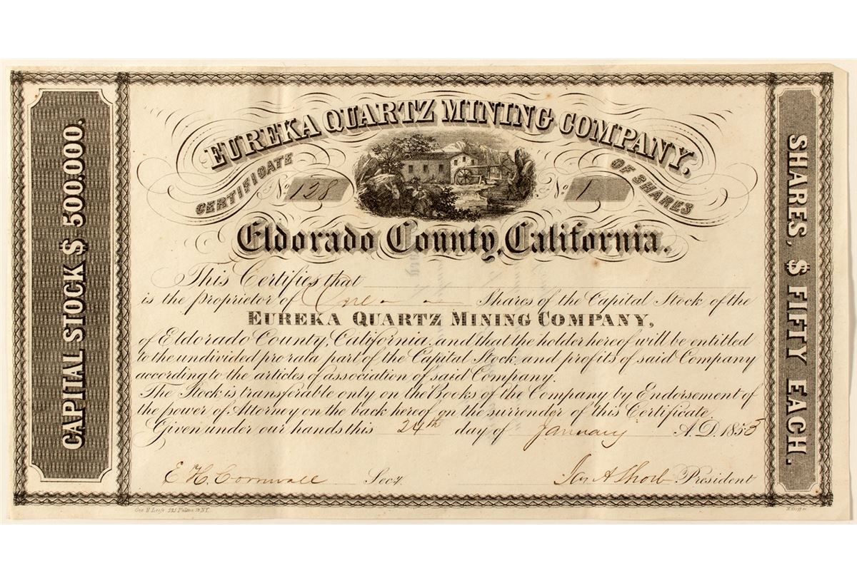Eureka Quartz Mining Company stock certificate, No. 128, for one share of capital stock. The issuee line is blank, but the stock is dated 24 January 1853. Signed by E.H. Cornwall, secretary, and James A. Shorb, president. Measures 11" x 6". Vignette of mill and miners top center. Uncancelled. VF. The Eureka Quartz Mining Company was likely operating in Georgetown, California. There was a second Eureka Mine in Placerville, but it was not active until decades later. The Eureka quartz mine at Georgetown had a 130-foot deep shaft in 1867. It was located immediately north of the Woodside on the same quartz vein, which was about two feet wide. They had a steam hoist, but no mill. The vein had a NE-SW strike and easterly dip averaging about $30 per ton, according to J. Ross Browne in Mineral Resources West of the Rocky Mountains, 1868. By 1882, the mine was 230 feet deep, inactive, and full of water, according to the History of El Dorado County, 1883. This is quite possibly the earliest known lode mining company stock certificate extant. Condition is excellent.