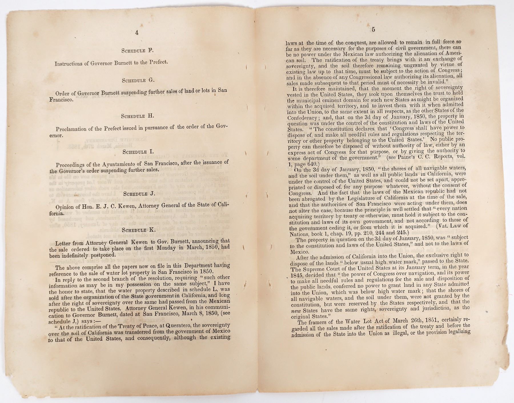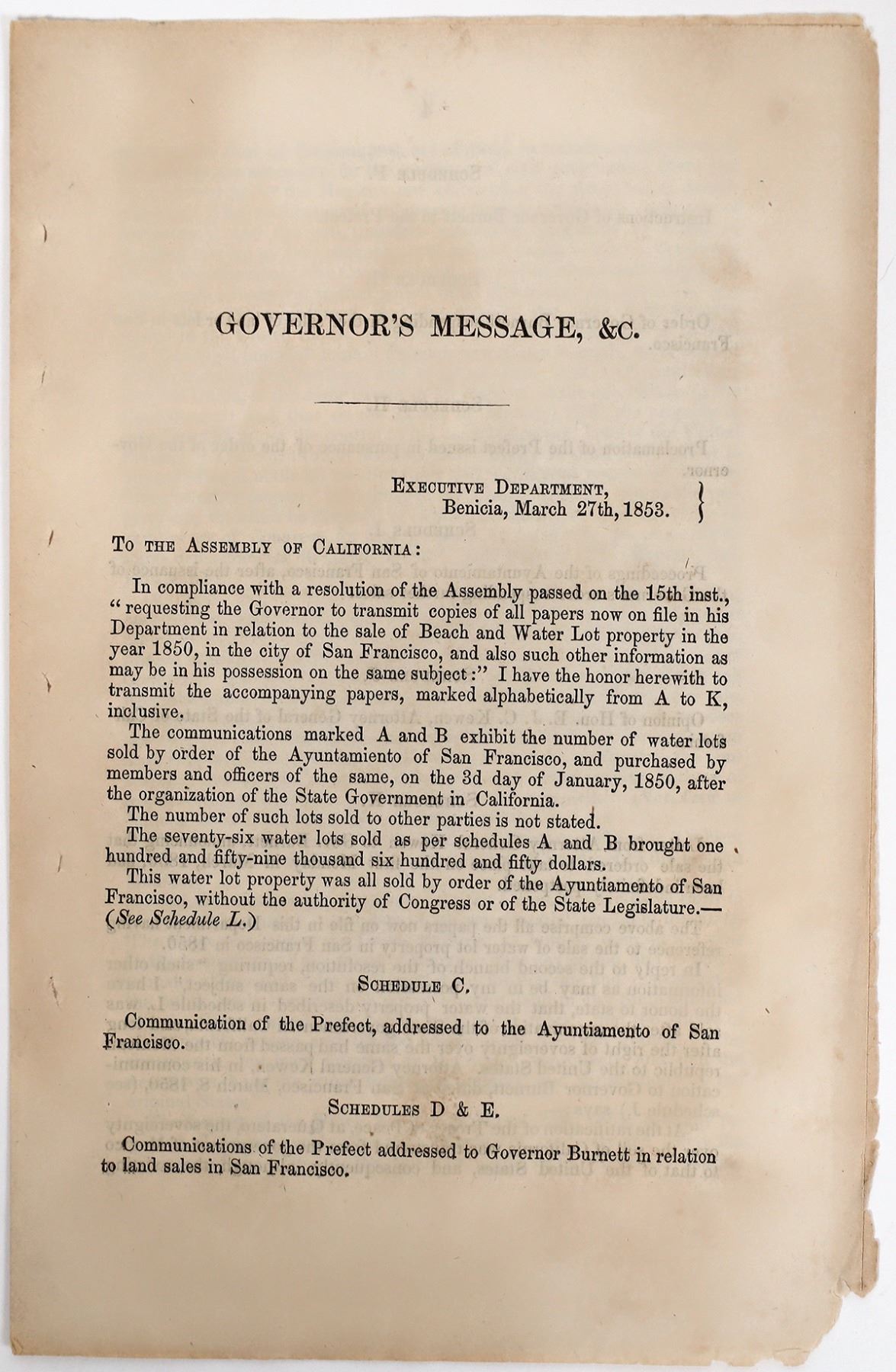 Governor's Message, Benicia, March 27th, 1853. To the Assembly of California from Governor John Bigler. Discusses the sale of water lot property in San Francisco in 1850. References the Treaty of Peace at Queratero where the sovereignty over the soil of California was transferred from the government of Mexico to the US. Also references the Water Lot Act of 1851 which regarded all the sales made after the ratification of that treaty and before admission of the State into the Union as illegal. 4pp. Taken from a book. 9.5 x 6" Rough edges. Bigler was California's 3rd governor, serving 1852-56. Lake Tahoe was also originally named Lake Bigler in his honor. While he enacted anti-Chinese policies, he was also part of the Free Soil Party that was against the spread of slavery into the Western US. California 1853
