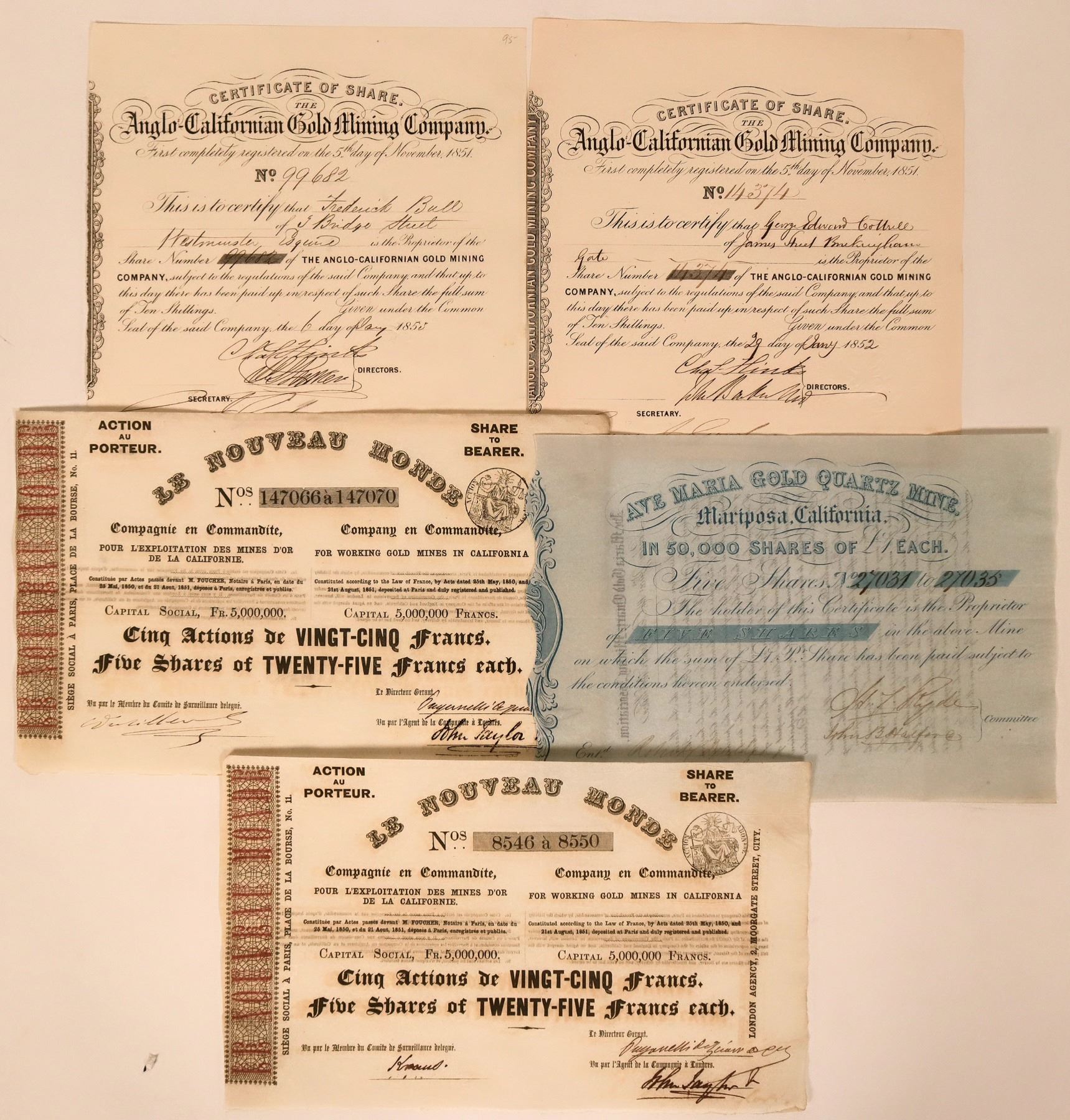 Five Gold Rush era stock certificates includes two Le Nouveau Monde stock certificates. Issued in Paris in 1850-51 for shares in working gold mines in California. Also included are an Ave Maria Gold Quartz Mine certificate, from Mariposa, Cal., for five shares, signed by committee members and secretary. Not dated or canceled. Clean. Very rare. According to the company's description detailed on the reverse, a London-based association held half the rights to the Ave Maria Gold Quartz Mine in the Mariposa District, California which would be worked under a lease with the owner of the other half. The Ave Maria was mentioned in a letter written from John Duncan to John Fremont on December 26, 1851. Two certificates from the Anglo-Californian Gold Mining Company are also included, both signed by two directors and a secretary, issued in 1852 and 1853. See photo for further details.