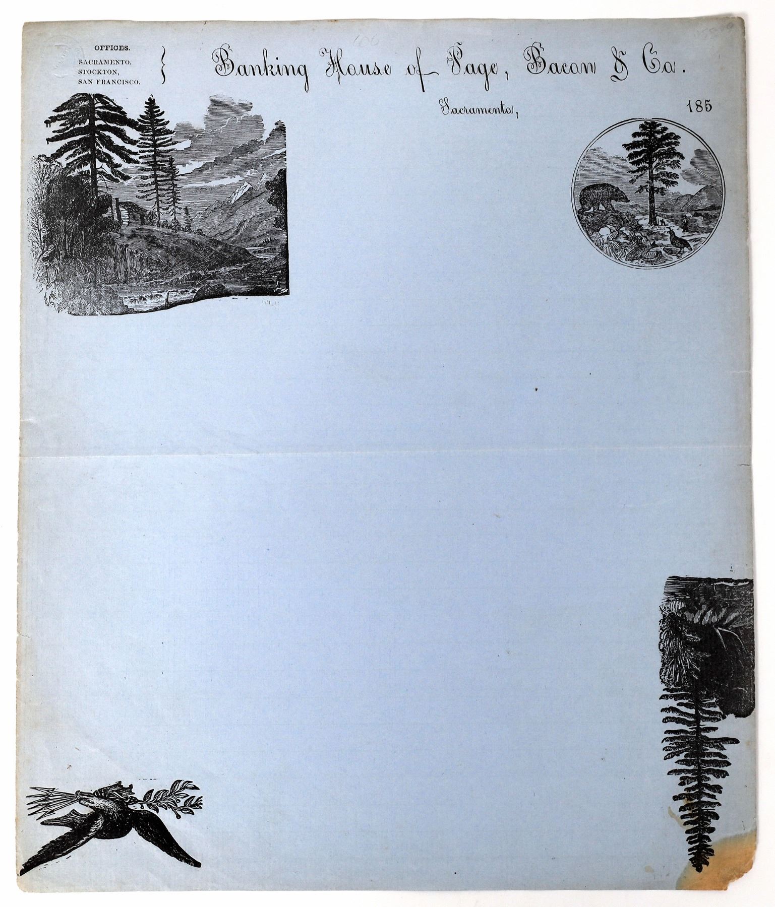 Extremely rare. Baird p. 24, N7. Baird calls this ad advertising piece, which FH does not agree with. Blue paper, black print. Banking House of Page, Bacon & C0. Dateline Sacramento, 185-. Lists three offices: Sacramento, Stockton, and San Francisco. Vignettes in each corner: mountain river scene (upper left), bear next to river (upper right), tree (bottom right), and eagle with arrows (bottom left). 11 x 9" Horizontal fold, toning around edges, missing bottom right corner and discoloration there too. No printer listed. Page, Bacon & Co. was founded in San Francisco in 1850 during the California Gold Rush. Their main office in St. Louis became overextended in 1854 due to problems financing a railway, and closed in January 1855. When the news reached San Francisco five weeks later, it triggered a run on the San Francisco house, which was also forced to close and affected other numerous other banks. This run was later known as "Black Friday." Sacramento California c1850s
