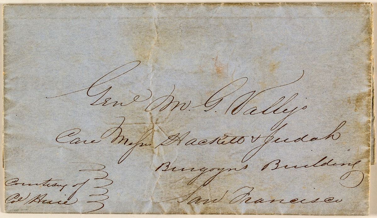 From Lucian Curtis and written to General Vallejo in care of Miss Hackett & Judah at the Burgoyne Building in San Francisco. He was [obviously] to move into the General's Rancho Petaluma Adobe, but was denied by the current owners. Arrived with furniture. Had to employ Colonel Huil's team to move it to the house [probably from a steamer that arrived up river from San Francisco]. "The German declined letting me take possession or receive my things.". I told them the articles belonged to you and they agreed to hold them in storage until you came. It turns out that Lucian and his 'boy' must remain at Vallejo's expense at with Colonel Huil. Huil would hand deliver the letter to the General. Curtis would eventually live in the villa. He was born in Connecticut and was a copper plate engraver and farmer. He did live one time at the famous Rancho Petaluma Adobe. Vallejo transferred 44,000 acres to the Rancho at one time. Small holes at some folds. City: Rancho Petaluma Adobe State: California Date: December 29, 1853 hwac# 33392
