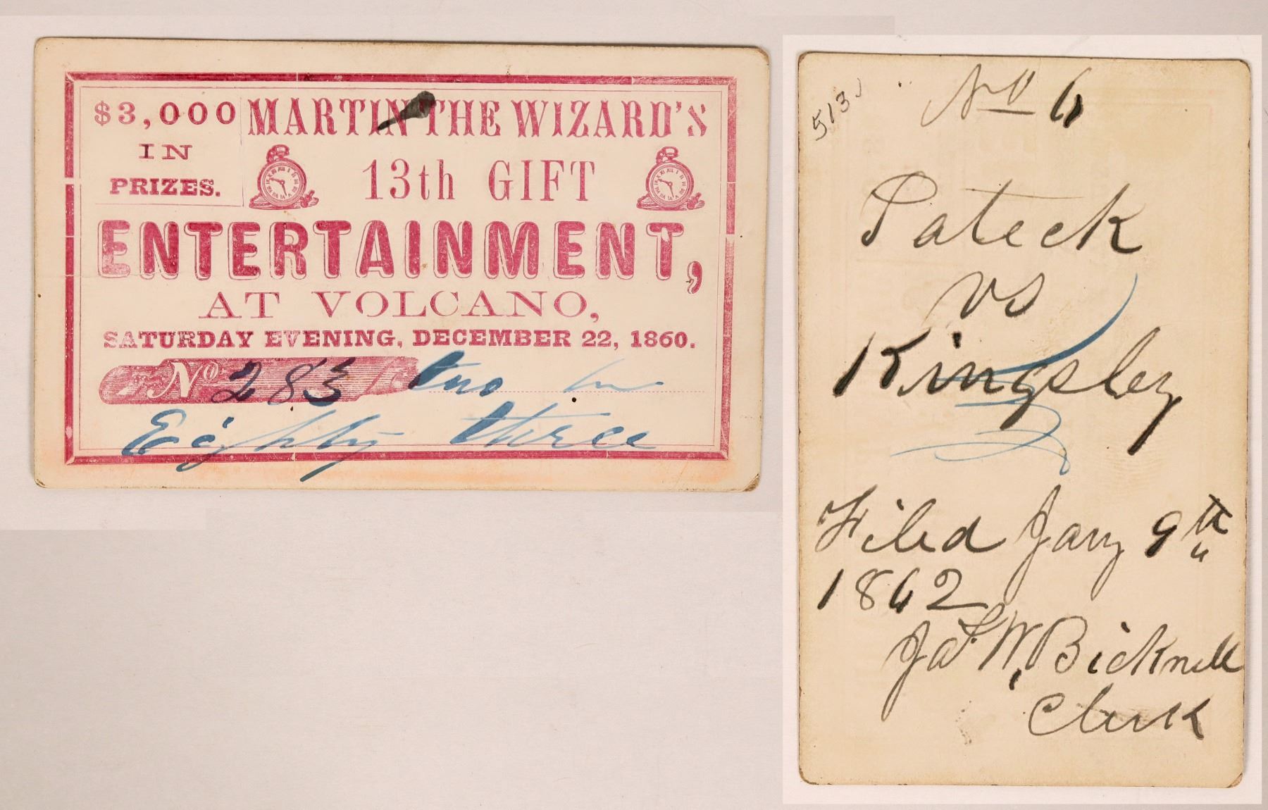 Red and white ticket: $3,000 in Prizes / Martin The Wizard's / 13th Gift / Entertainment, / At Volcano, Saturday Evening, December 22, 1860 / No. 283. Writing on reverse: Patick Vs. Kingsley / Filed Jan 9th / 1962 J. F, W. Bicknelll / Clerk. 3 x 2 1/2 inches. Rare gold rush town. The area was first known designated by Colonel Stevenson's men, who mined Soldiers Gulch in 1849. In 1851 a post office was established and by April 1852 there were 300 houses. By 1853 the flats and gulches swarmed with men, and there were 11 stores, six hotels, three bakeries, and three saloons. Hydraulic mining operations, begun in 1855, brought thousands of fortune seekers to form a town of 17 hotels, a library, a theater, and courts of quick justice. Ex: Ron Lerch Collection.