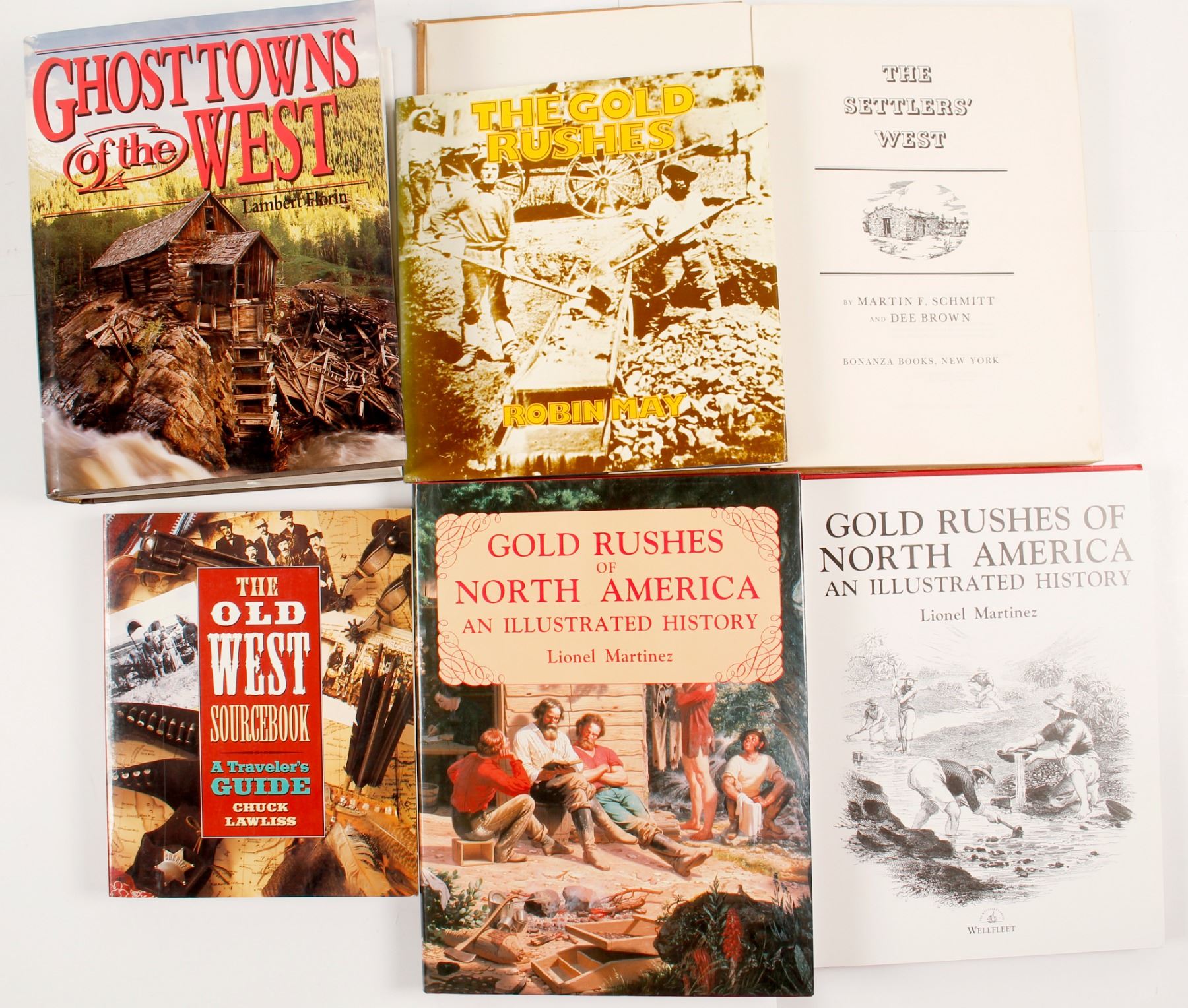 Hard covers. The Gold Rushes by May. The Old West Sourcebook, A Travelers Guide by Lawliss. Ghost Towns of the Old West by Florin. The Settlers West by Schmitt and Brown. Gold Rushes of North America by Martinez (2).