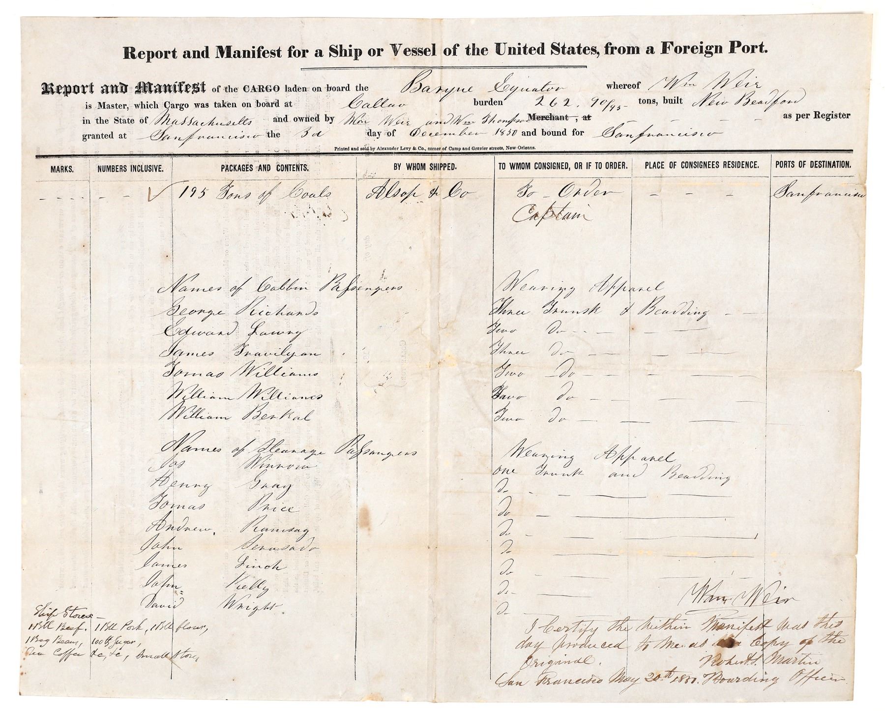 Exceptionally important. This is the Report and Manifest for a Ship or Vessel of the United States, from a Foreign Port. Cargo on the ship Barque Equator, William Weir is Master, taken on at the port of Callao (in Peru). Cargo is 195 tons of coal for Alsop & Co. in San Francisco. Also lists six cabin passengers and eight steerage passengers, as well as the ship stores of beef, bacon, flour, coffee and sugar. Ship built at New Bedford, Massachusetts and owned by William Weir and William Thompson. Bound for San Francisco, so the ship had to go around Cape Horn. They departed Massachusetts in December 1850 and arrived in San Francisco May 1851. Signed by William Weir. 12.5 x 15.5" Black print on blue paper by Alexander Levy & Co., New Orleans.