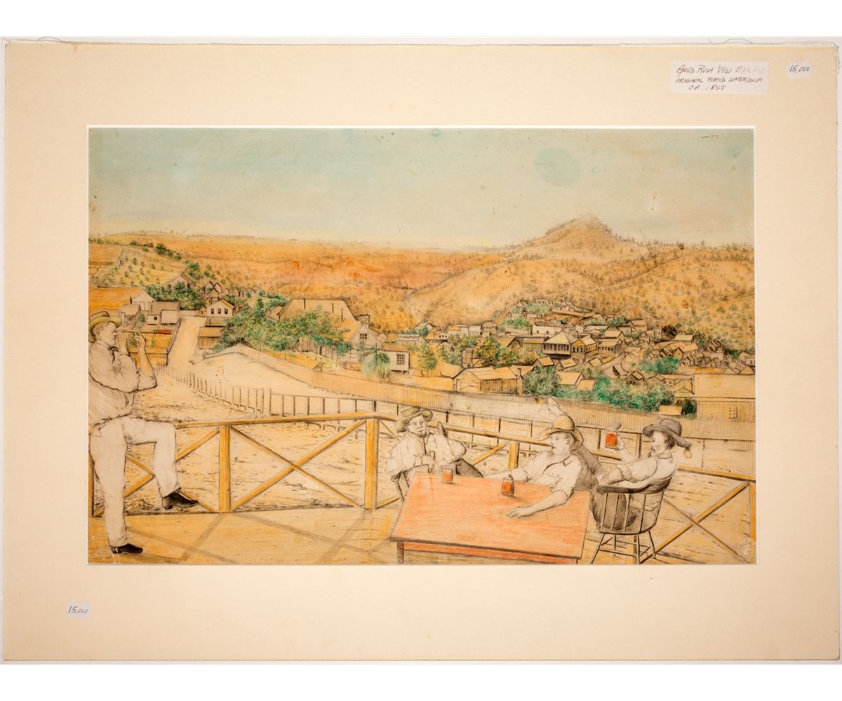 Original watercolor of the Gold Rush view at Mokelumne Hill. The view is from a three story brewery looking toward the town and hills. It shows a group of miners in the foreground enjoying a beer, as one of them looks through a telescope. The painting was hanging in the Mokelmne Hotel until 2000, and for as long as anyone can remember. In a matte, it is 19" H x 25.5" W. Burger Collection