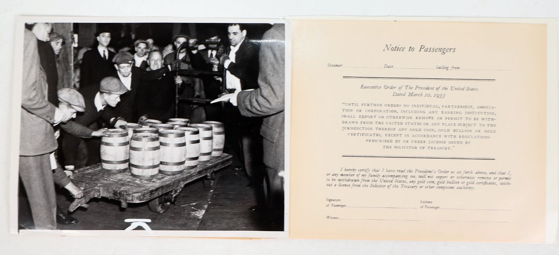 Wide World Photos print of the U. S. shipping gold to France via the S. S. Normandie at Pier 88, North River. This was the U.S. first sale of gold since March 2, 1936. The photo was used by the Baltimore Sun and is black and white, 9 x 7 inches. Also an original "Notice to Passengers" enforcing the President's Order of non-export of gold issued to passengers heading overseas, preventing them from removing gold from the United States. The executive order was issued March 10, 1933. Unissued, 8 x 7 inches.