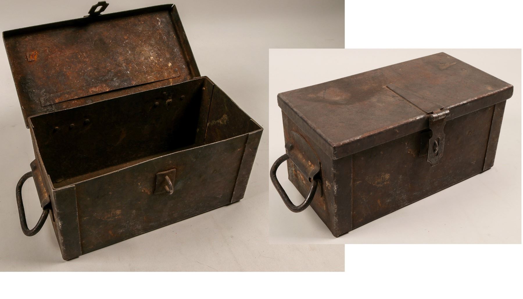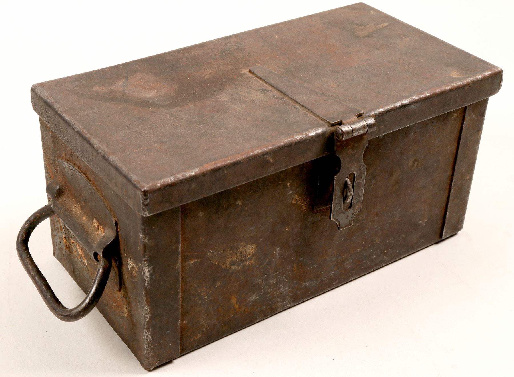 Bullion Box got gold with stops on handles. 12.5" x 6.5" x 6". The weight is 8.8 Lbs. Classic c1900 box to carry gold coin.