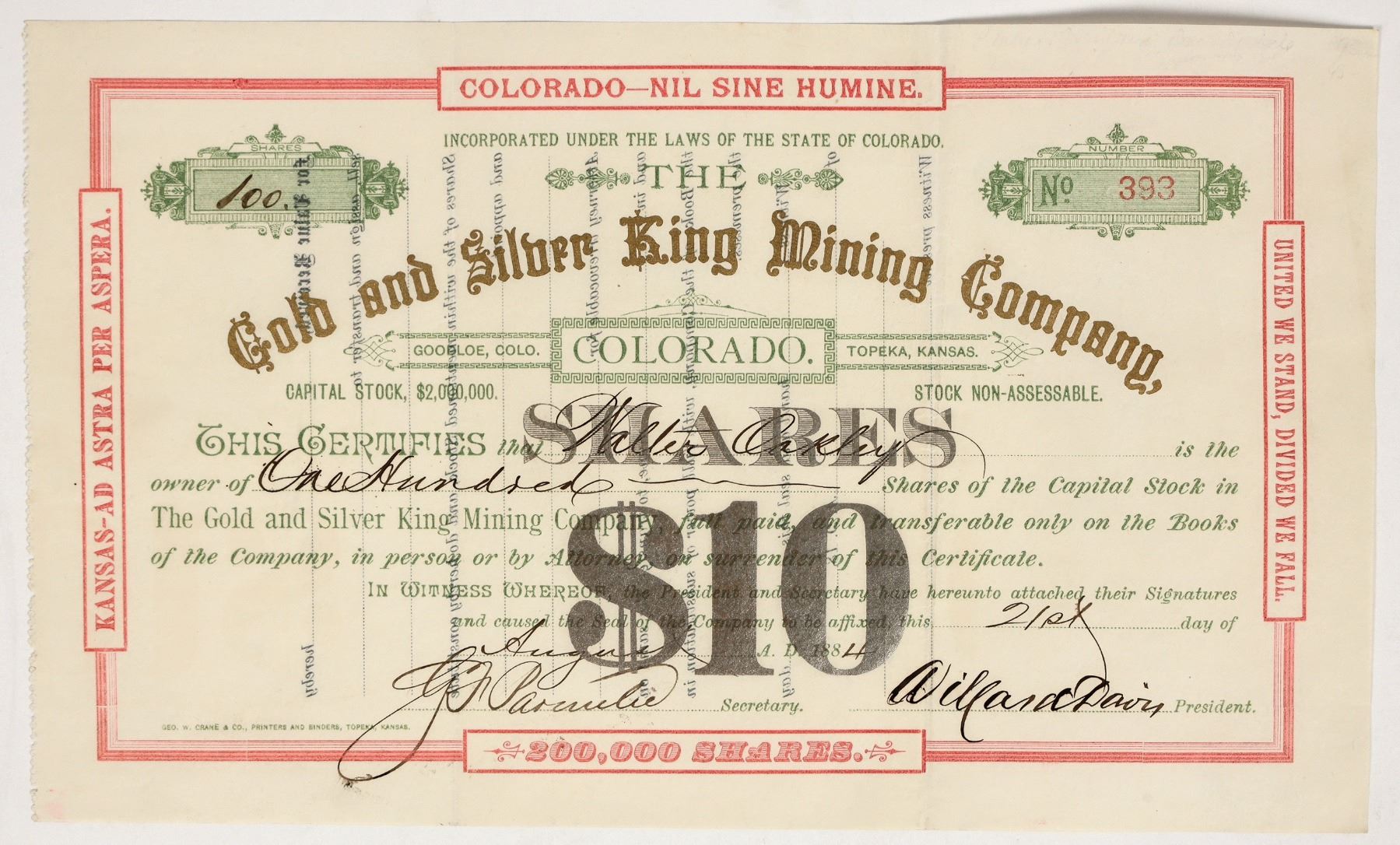 Very rare. We have only sold two of these in the last 11 years. Inc. in Colorado. No. 393, issued for 100 shares to Walter Oakley in 1884. Signed by (General) Willard Davis as president and the secretary. Not cancelled. Red border, green and gold text. Folds, clean. "Goodloe, Colo." and "Topeka, Kansas" printed under title. We could not find any reference to Goodloe--it must have been short-lived mining camp. Six miles from Pittsburg, Colorado was Dark Canon where the company's Silver King mine was located. The Silver King was a large vein of galena in cretaceous shales. Ore grades were from 10-200 oz. silver per ton with some samples also showing 1 oz. of gold (E.M.J. Vol. 38, 1884, pp. 88)