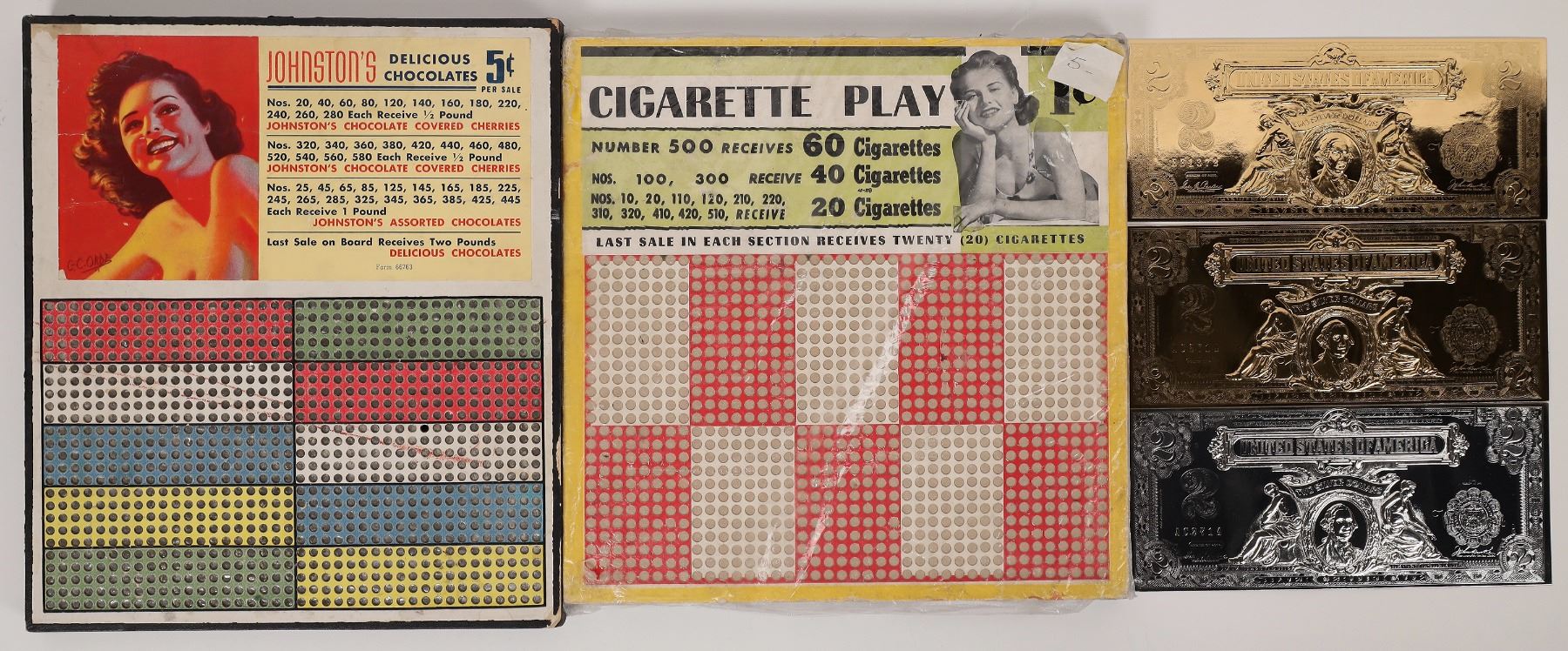 The National Collector's Mint has Barry M. Goldwater Jr. as a director and markets replica U. S. Currency in silver and gold plated pieces. Here is a $2 gold certificate; a 2004 $2 silver certificate and a 2004 $2 gold certificate, with Certificates of Authenticity. Also two punch boards: "Cigarette Play" and Johnston's Delicious Chocolates. Boards are 9 x 10 inches and unused.