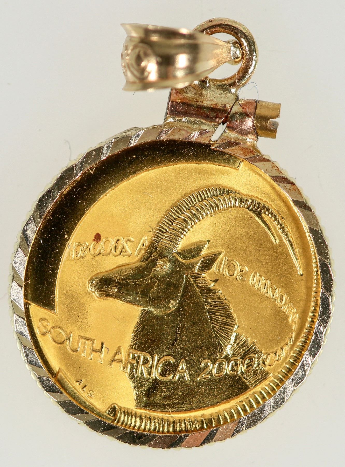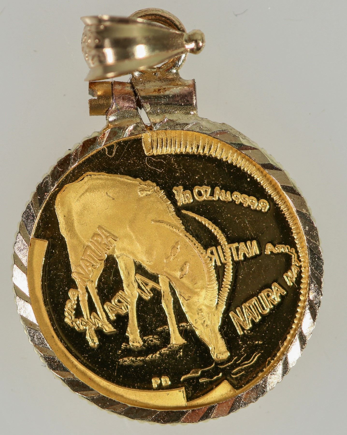 Non circulating commemorative coin of the Monarchs of Africa series. 1/10 ounce, Natura - Sable Bull, KM 258. Minted at the South African Mint. 16.5 mm; 3.11 grams; .999 gold. With a 14 carat jewelry bezel. Total weight: 4.2 grams.