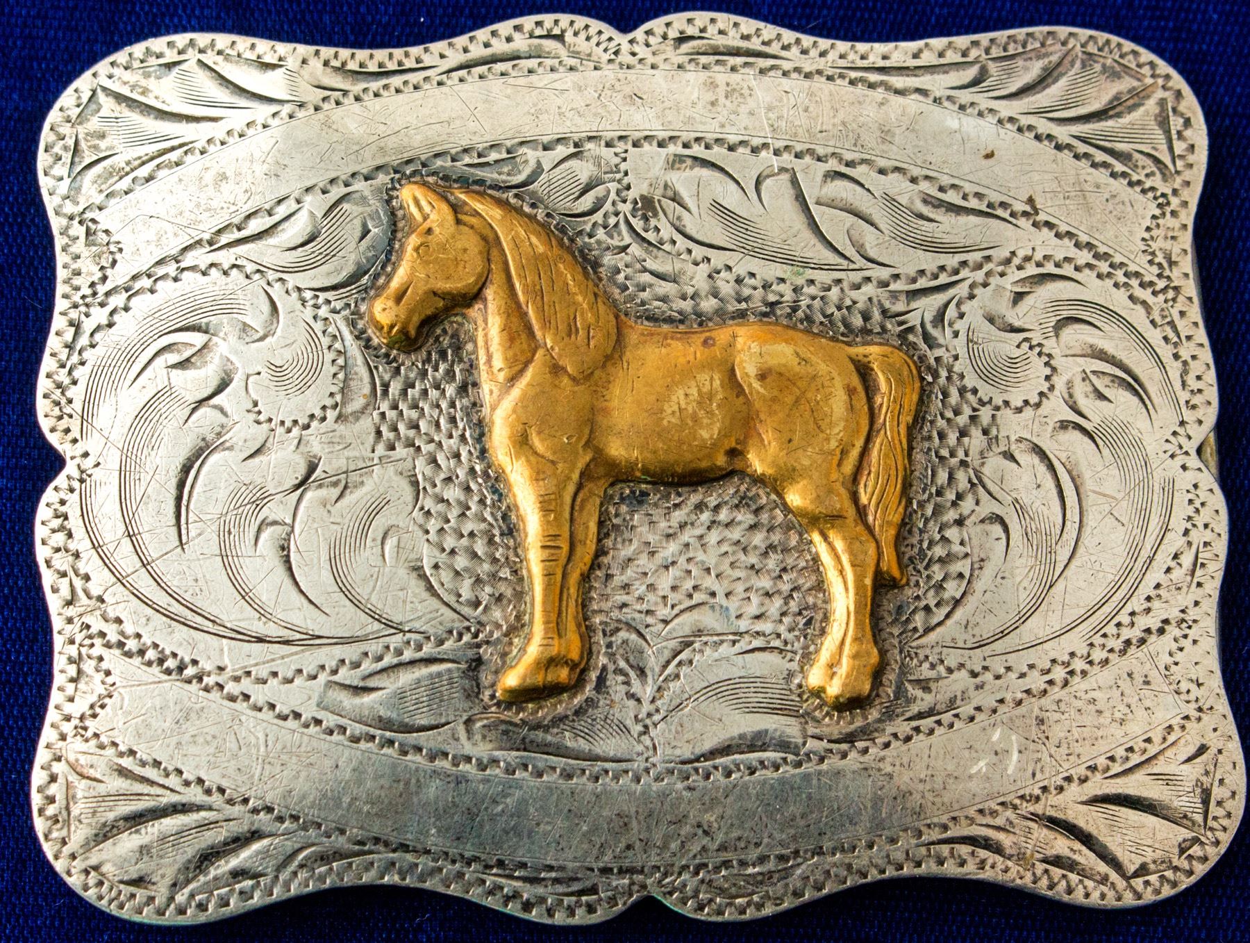 Rectangular curved edges western belt buckle with gold stallion overlay (14K?). Detailed worn background exhibits light scratching. Size: 3.5" x 2.75" Weight: 74.9 grams. Stamped with Phoenix Arizona B-K Silversmiths Hand Engraved Sterling Silver. State: City: HWAC#: 47926 Date: