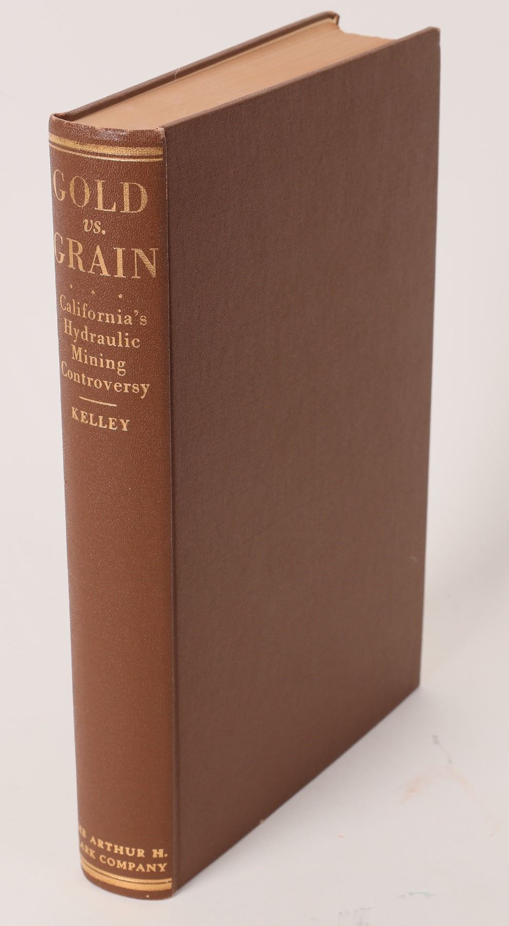 Gold Vs. Grain: The Hydraulic Mining Controversy in California's Sacramento Valley: Robert L. Kelly, 1959 Glendale, CA: Arthur H. Clark Company. Brown cloth hardcover with gilt lettering to the spine. First edition. 8vo. [327 pp] Illustrated by 11 illustrations of scenes of mines and one-fold-out color map. Volume I of the Western Land and Waters Series. Limited to 1265 copies printed. This pioneering work highlights the long and bitter opposition of residents and farmers of the Sacramento Valley to the damage caused by flood-carried hydraulic mining debris. The severe erosion and consequent flooding of the valley caused by hydraulic mining are examined both historically and environmentally. Old photos of Placer operations, Flumes and Hydraulic Mining during the Gold Rush. Brown cloth, with gilt lettering to the spine, top edge colored, other edges untrimmed. (A.H. Clark Co., Bibliography and History, Clark & Brunet #158.) Contents are complete, bright and clean, binding is tight. Except for inside covers (ex-lib stains/markings) in Fine condition.