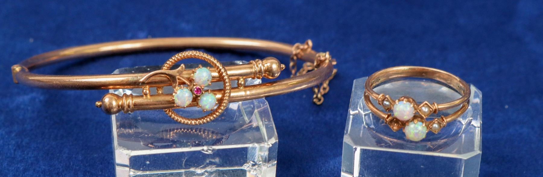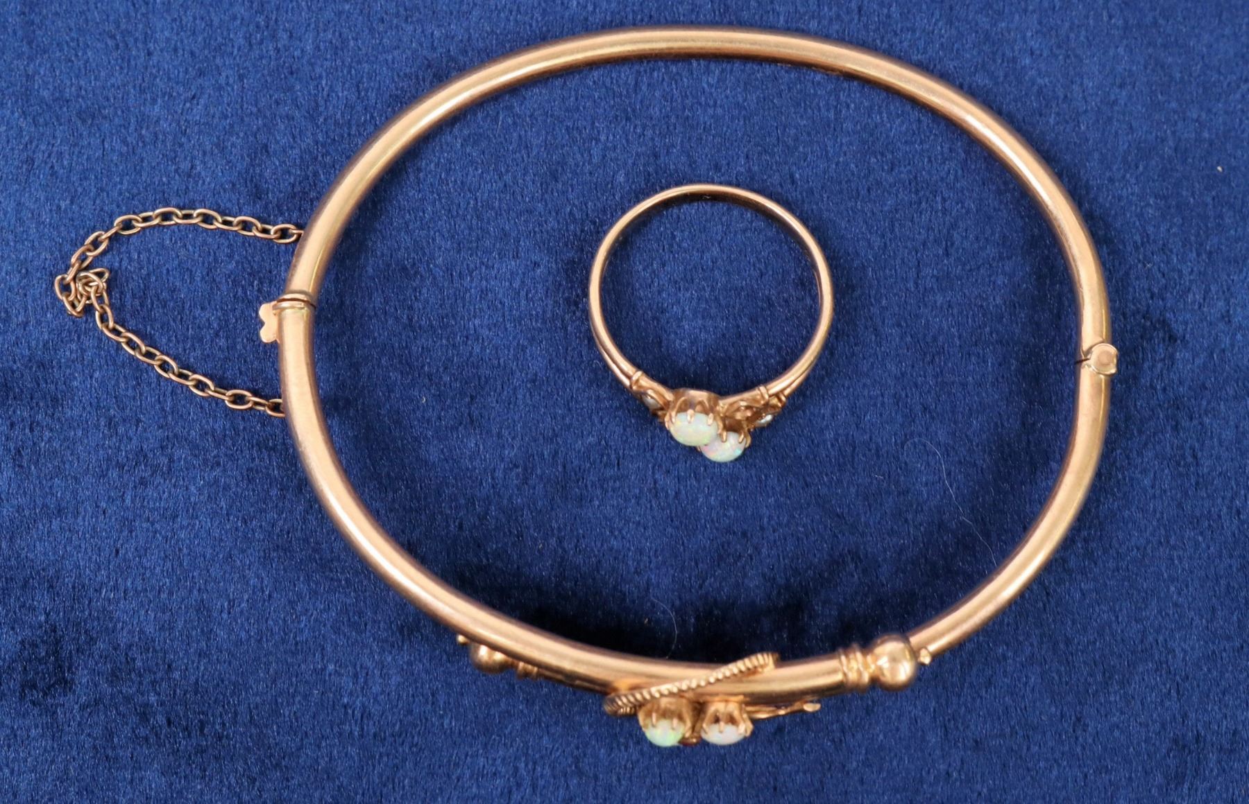 Elegant 14K gold oval bangle bracelet with overlapping center bands set with 3 small opals. 14K gold ring set with 2 opals and 3 tiny pearls, one missing pearl, size 7. Very distinct pieces.