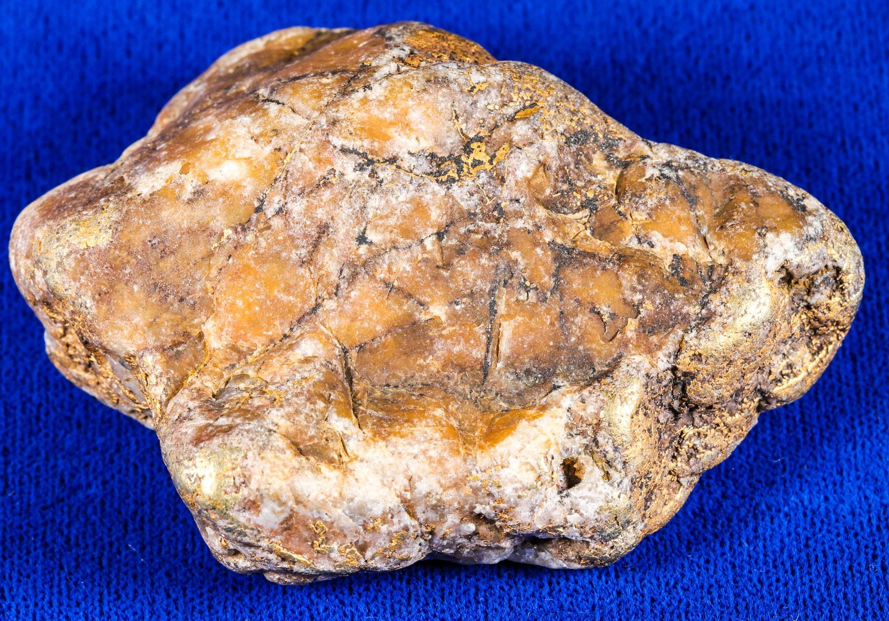 Impressive nugget of gold metal and white quartz believed by the consignor to have been collected by his father who worked at the Knob Hill Gold Mine outside of Republic, Washington. This nugget is about 2.6 x 2.0 x 1.0 inches and weighs 6.15 troy ounces (191.4 grams). By appearance, it is approx 65% gold metal.