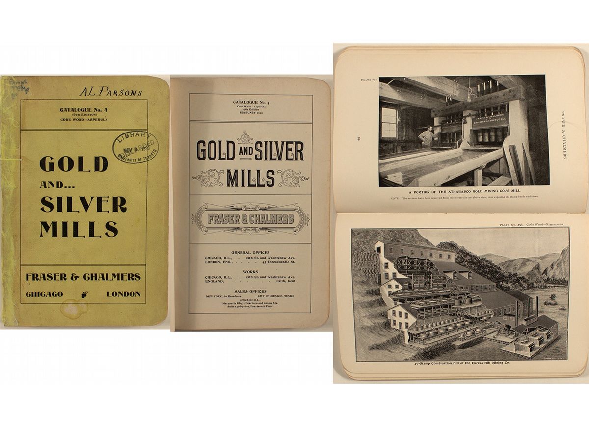 Few mill catalogs exist! 9th edition. February 1900. Chicago & London. Light green softcover. 252 pages. Index in the front. Previous owner's name written on front: "A.L. Parsons." Photographs, illustrations, diagrams of crushers, stamps, and mills. Includes descriptions of facilities they have built and an in-depth description of the machinery. Measures 6" x 9" Condition: Previous library copy. Library stamp on front cover. Stains. Missing spine cover. Pages very clean. Rarity: [v]City: County: State: Date: