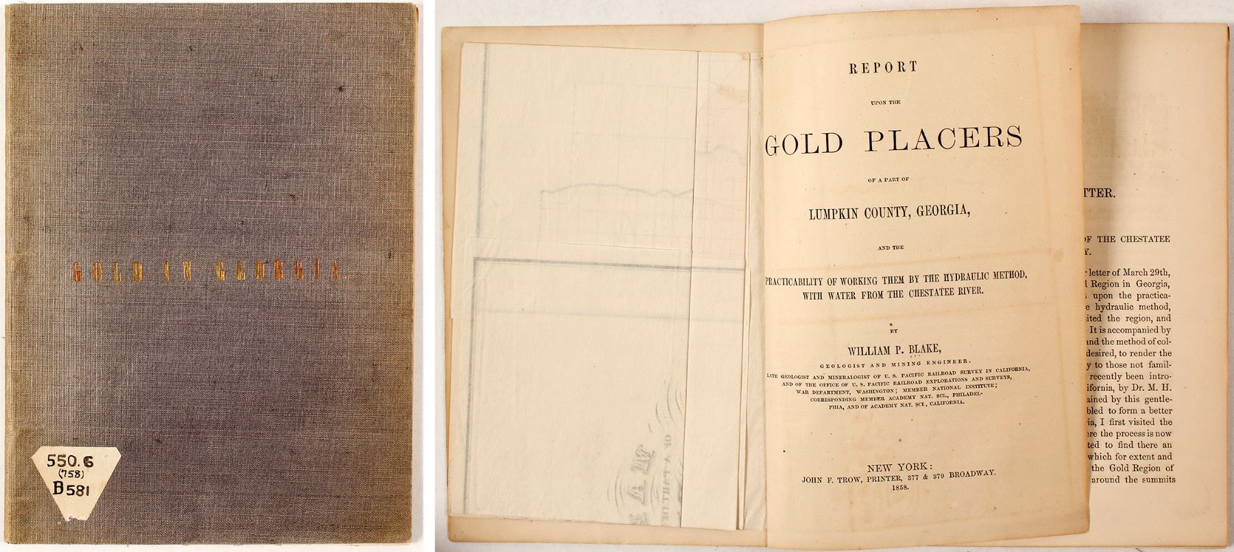 Considered an informal prospectus of the Chestatee Hydraulic Mining Company and unarguably the most important geologic report from early Georgia mining operations. . Report Upon the Gold Placers of a part of Lumpkin County, Georgia and the Practicality of Working Them by the Hydraulic Method, with water from the Chestatee River. William P (Phipps) Blake, J. F. Trow, printer, New York, 1858. 39pp, original purple cover with gilt lettering “Gold in Georgia”, 6 x 8” with 15 x 20” map attached to left side of title page, as original. Map has no splits or discoloration. The gold region is colored in red, and the gold bearing creeks and rivers are colored in yellow. Provenance: Vigouroux Collection.