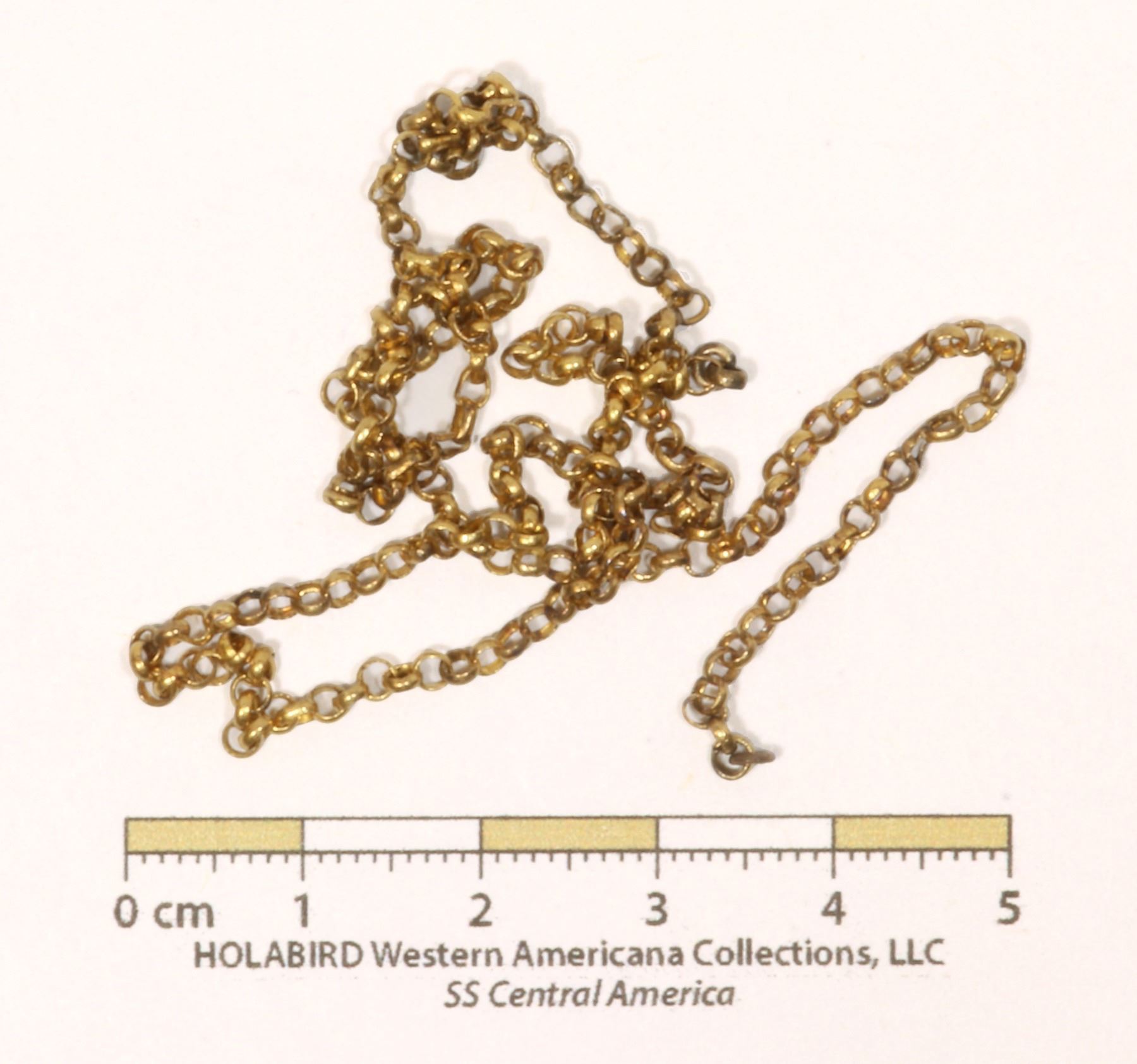 Small gold-toned cable chain, approx. 37mm in length, made of 2mm circular links. There is no clasp or hook on either end. Does not test as gold., 3 grams (0.096 ozt).