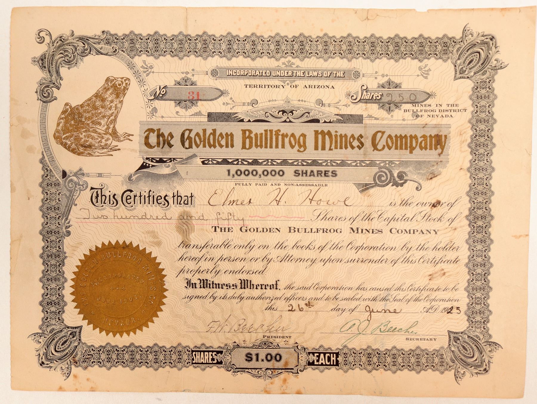 Rare. Inc. in Arizona, 1905. No. 31, issued for 250 shares to Elmer H. Howe on June 26th, 1925. Signed by president F.W. Beecher and secretary A.J. Beecher. Not cancelled. Black border and print. Gold title and golden vignette of bullfrog! Condition issues incl. heavy folds with tape repairs, foxing and staining. 8.25 x 11" "Mines in the Bull-frog District of Nevada" printed in the upper right. Not in Filer or Holabird indexes. According to 1905 Los Angeles Times ads, the company had 5 claims in the heart of the Bullfrog District. No additional information located. Ken Prag Collection