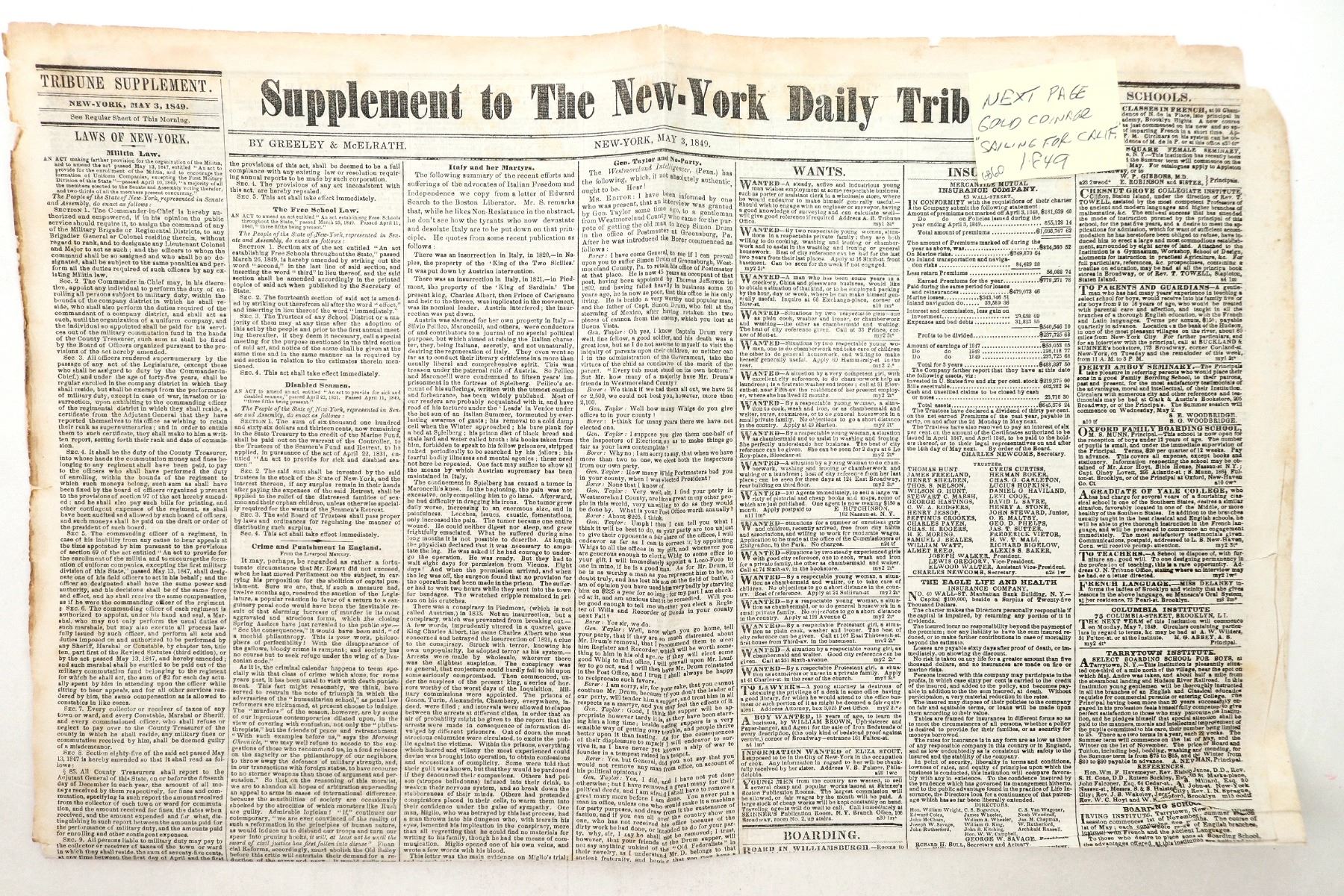 Two page broadsheet of the May 3, 1849 edition of the Supplement to The New York Daily Tribune, featuring an article titled The Golden Chronicles Number Twelve about companies of men heading for the California gold fields. Including a group from Massachusetts intending to establish a private mint in California. Wm. H. Haydn goes out as assayer, with machines that can coin $10,000 a day.