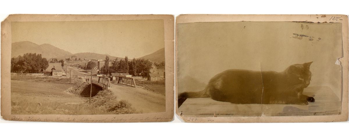 This is a view of Golden taken from the other side of Clear Creek. The creek, bridge, men walking on the street, businesses, and residences along the main street. One three-story brick building has a sign that says 'groceries.' Photographer is unknown, The photo is not cut in a straight line indicating that it may have been done by an amateur. If this author was an amateur, he/she was a darn good one. Both left corners have been cut, but that does not affect the picture. Someone took advantage at one time of this card stock to glue a picture of their cat on the back? Maybe they didn't appreciate the historic value of this photograph. 8 1/2 x 5 1/2".