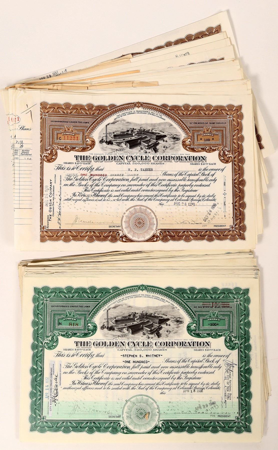 Lot of 100 issued stocks, all issued in the 1930s. 50 green border and 50 brown border, black print, and vignette of the company's cyanide and flotation plant at Colorado Springs. Punch cancelled. This company dates back to 1895, when DH Moffat was associated. At that point, they owned the La Bella, Legal Tender, Harrison claims on Bull Hill.