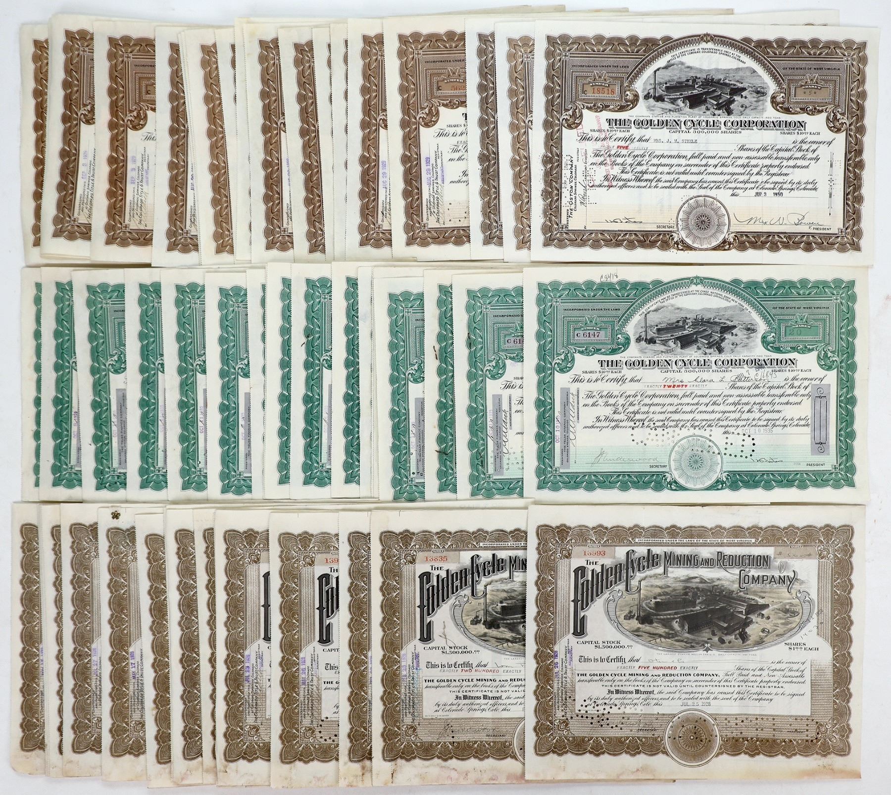 1. (20) The Golden Cycle Corporation - Circa 1929-1950. Brown Bonds. I/C, Embossed, Colorado 2. Lot (20) Golden Cycle Mining and Reduction. Company - Circa 1928. I/U, Embossed, West Virginia 3. Lot (20) The Golden Cycle Corporation - Circa 1935. Green Bonds. I/C, Embossed, West Virginia