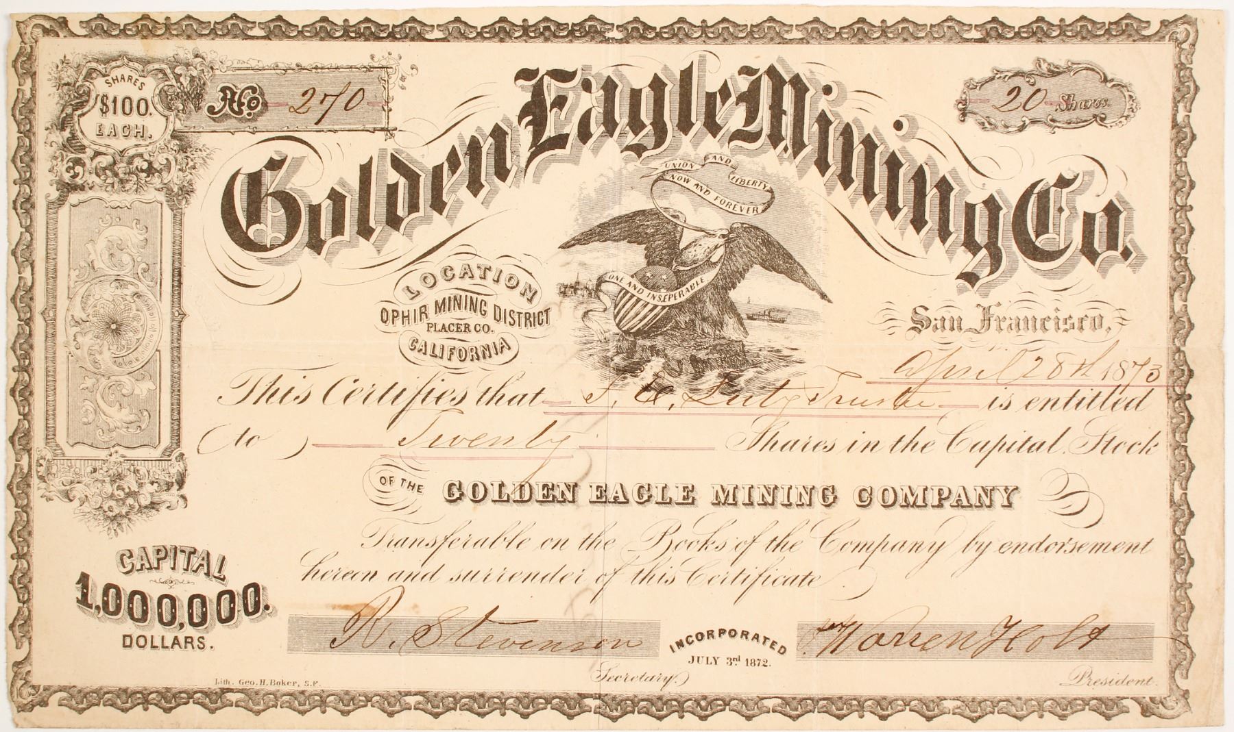 # 270 for 20 shares to F Lutz trustee. Signed by secretary R Stevenson and president Warren Holt. Stateline San Francisco 1873. No revenue stamp. Not cancelled. Incorporated in 1872. Location: Ophir Mining District, Placer Co., California printed to the left of the eagle vignette. The Ophir district is located in the vicinity of the old town of Ophir, a few miles west of Auburn. Gold bearing gravels were discovered at Ophir and Auburn in 1848. The quartz veins were developed and the Ophir and Duncan Hill districts were organized. Appreciable amounts of high-grade ore were recovered from the 1860's- 1880's (Mindat.org). According to Gudde, the district's gold production exceeded $5 million. Ophir is now a ghost town, but shows on most modern maps. Eagle and shield vignette. George H Baker printer. Good condition. Aging color, bottom left corner torn, e80426tc. Prag Collection