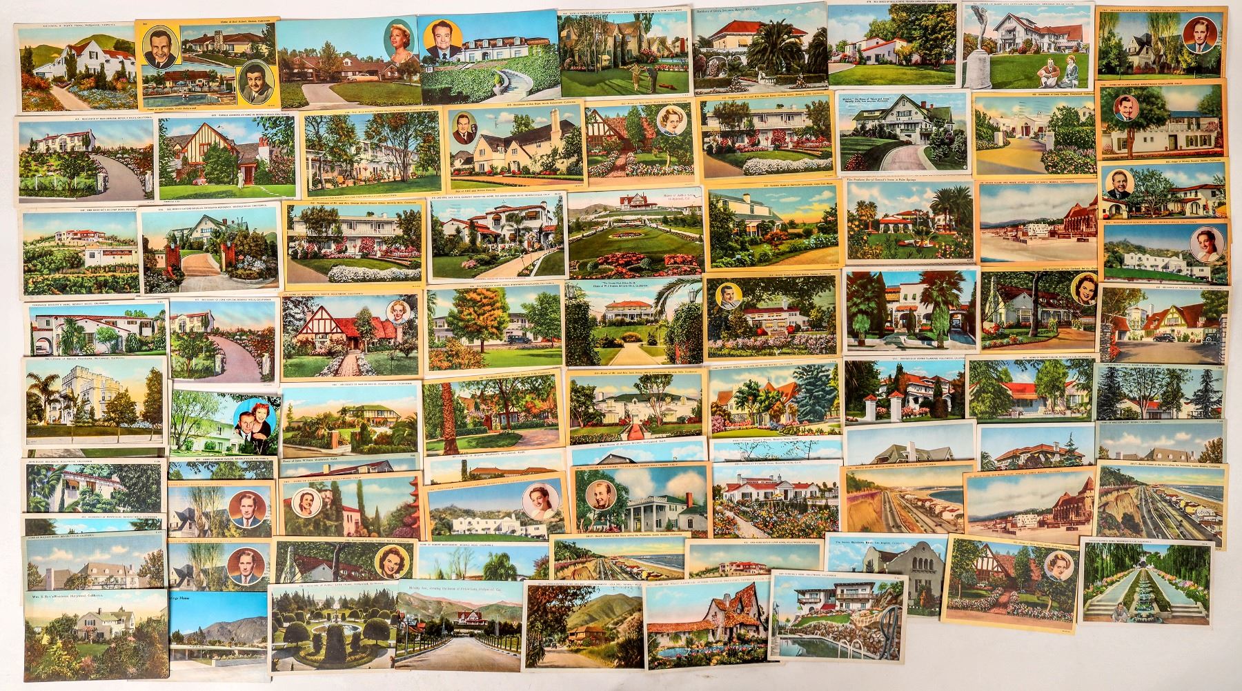Lot of 70+. Color with white and color borders. Postmarks: Arlington VA., San Pedro, Monrovia, Bakersfield, Los Angeles Arcade STA. (diff ones), San Dimas. . These are all street level view, a few names: Shirley Temple, Dinah Shore, Jack Dempsey and Estelle Taylor in front yard,Wallace Berry, Myrna Loy, Jean Harlow, Bob Hope, Monte Blue, Red Skelton and Beach Club of Santa Monica and lots more. Some have the stars posing in front of homes. No protective sleeves, but are in great cond. California Hollywood 1920's-1950's Ken Prag Collection
