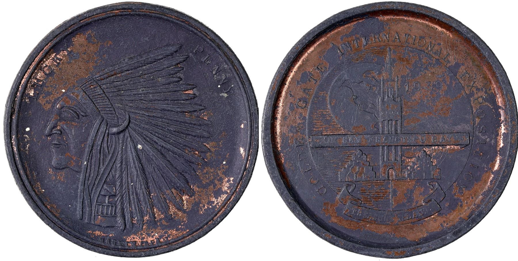 Copper plated pot metal, 58 mm. Obv.: full horned Indian Head / Lucky Penny; rev.: Golden Gate International Exposition / San Francisco Bay. San Francisco California