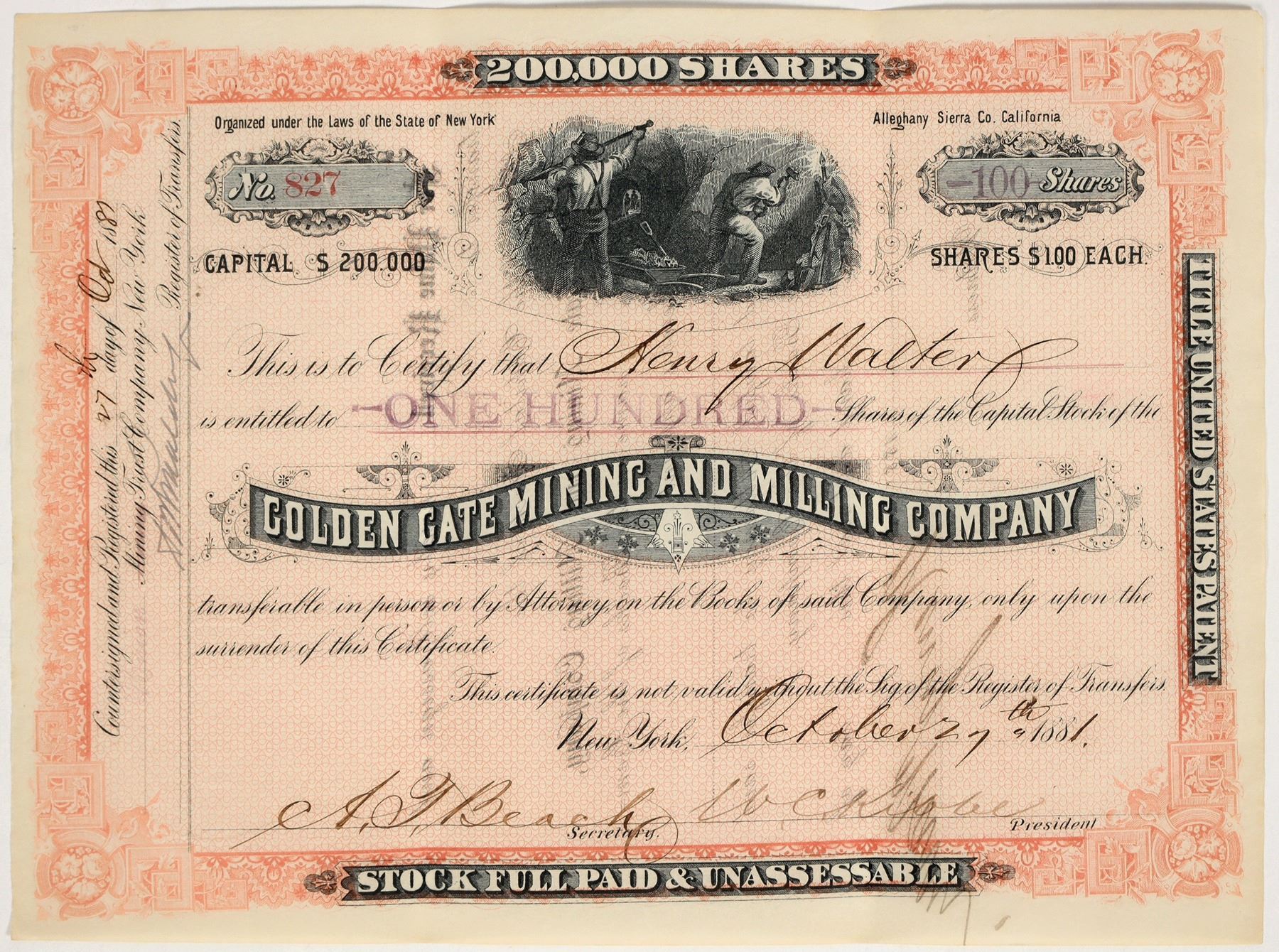 "Alleghany Sierra Co. California" printed at upper right. Organized in New York. No. 827, issued for 100 shares to Harry Walter in New York in 1881. Signed by president WC Kibbe and secretary A. Beach. Not cancelled. Orange border and background, mining vignette. Folds. 7 x 9.5" In 1881, it was reported they bought the Oriental Mine.