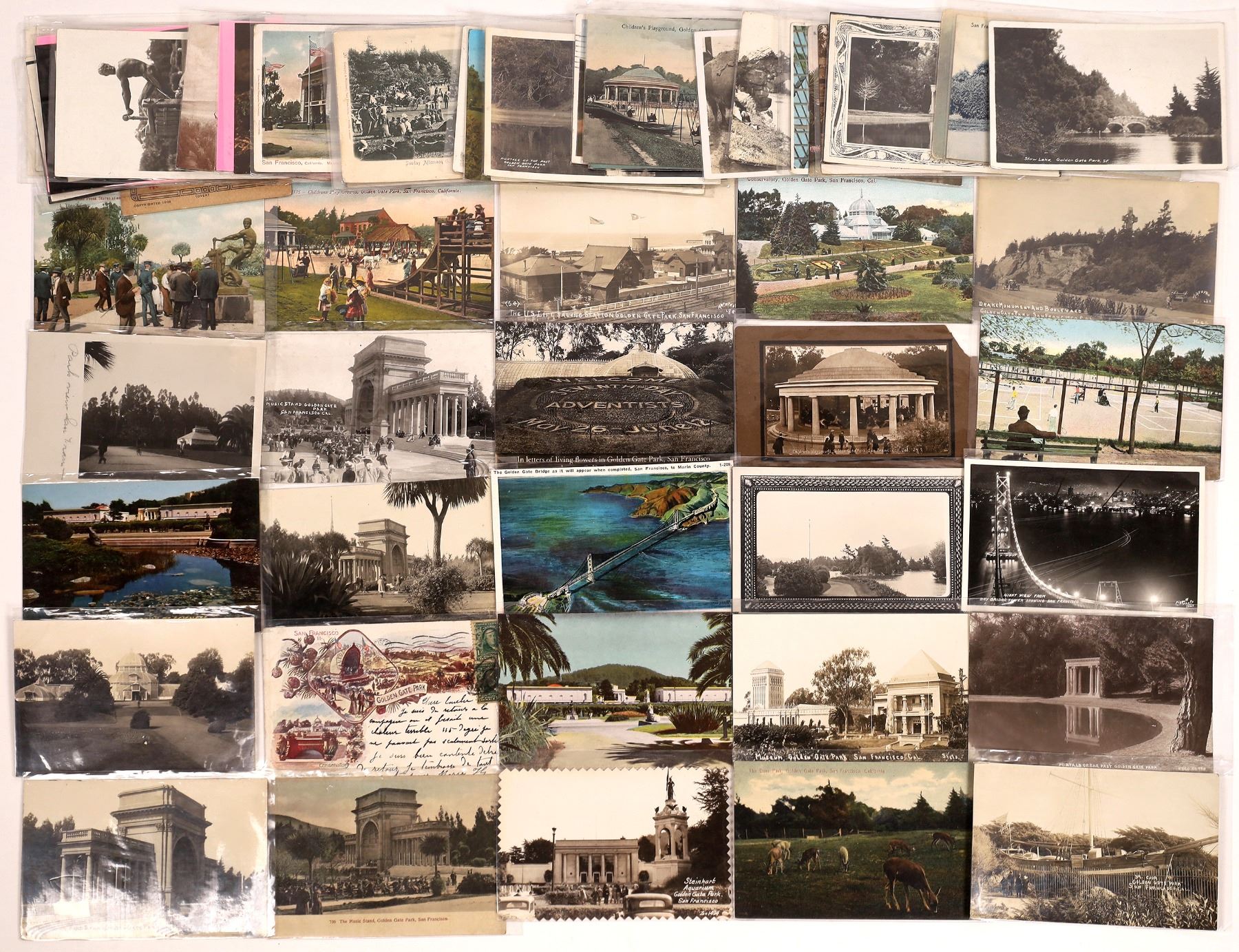 Lot of over 50 vintage postcards from Golden Gate Park San Francisco. Animals (buffalo, bears, burros); buildings, people scenes. Also a 1934 annual pass entitles holder "To the softest seat to be found on any of the benches in Golden Gate Park."