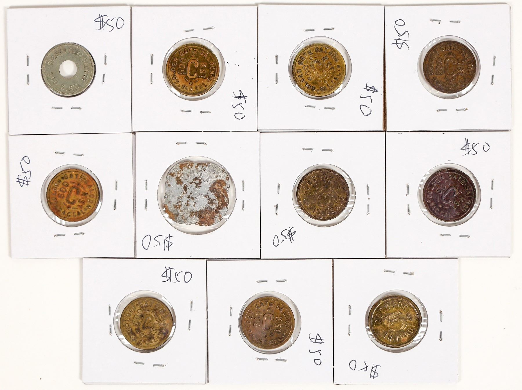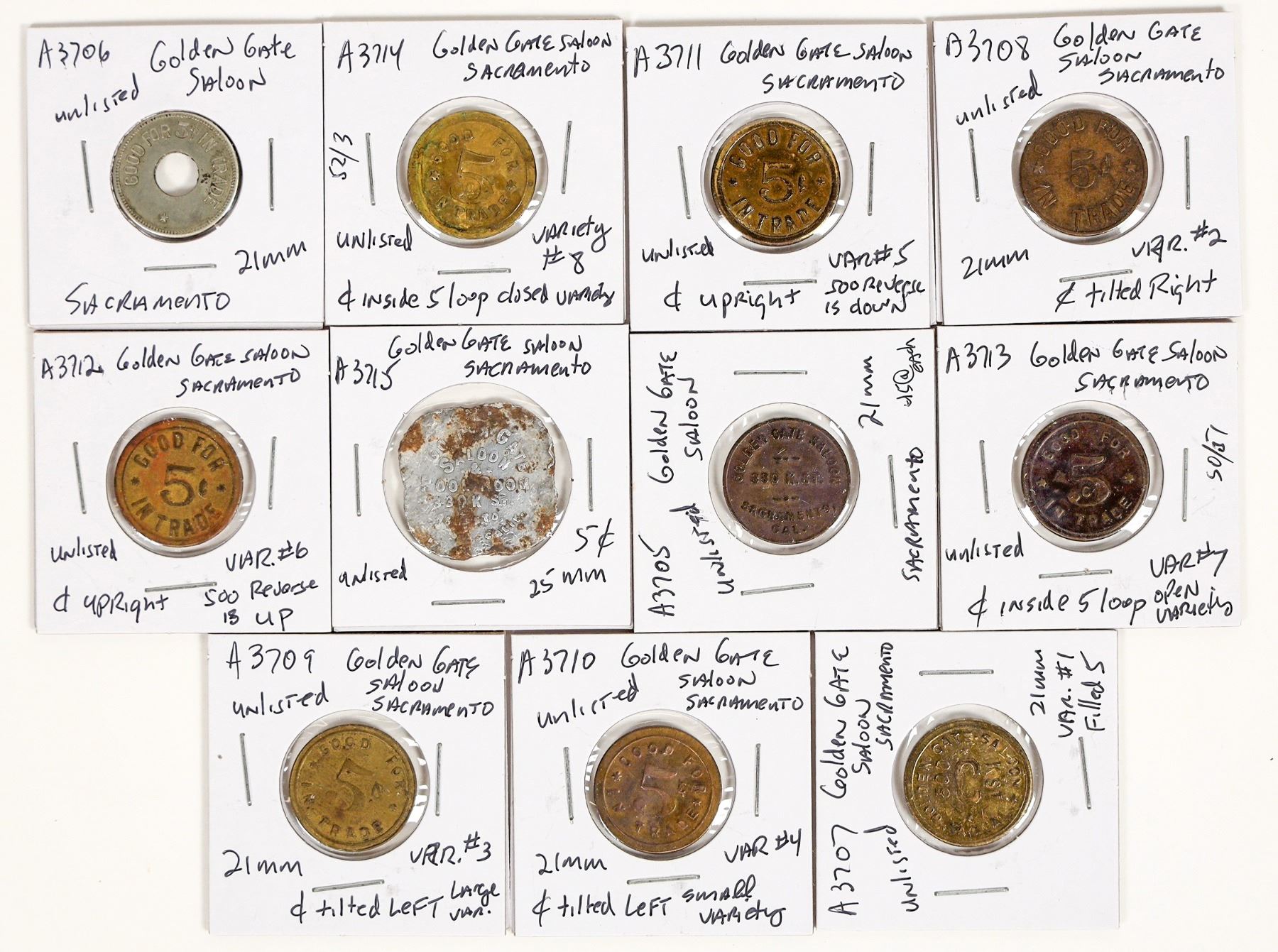 Lot of eleven tokens from the Golden Gate Saloon, 330 K Street, Sacramento. Nine different varieties of round bronze tokens, white metal with center hole; white metal scalloped.