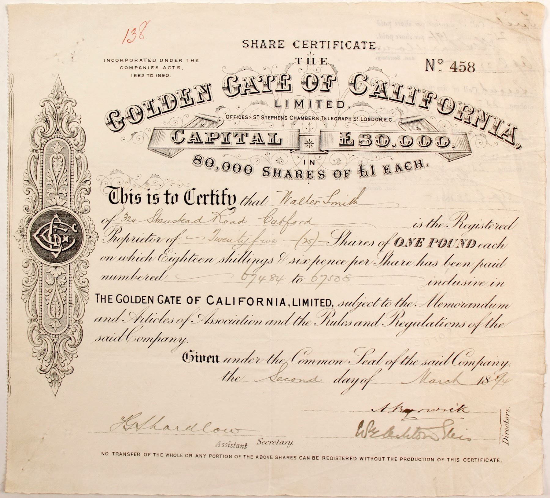 Twenty Five shares of Golden Gate of California stock, number 458 issued to Walter Smith dated March 2, 1894. Ken Prag Collection. State: california City: Date: HWAC# 81855