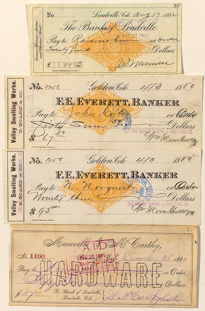 Lot of four checks all with RN-G. 1) Two checks from Valley Smelting Works, G. Board & Co. (The Moore Mining & Smelting Co. stamped over), drawn on F.E. Everett Banker. Golden, Colorado, 1880. Folds and cut cancels. This variety not listed in Castenholz. 2) Manville & McCarthy, Hardware, drawn on Bank of Leadville. Dec. 23, 1881. RN-G on reverse of check. Folds and cut cancel. 3) Bank of Leadville. Aug. 17, 1882. Cut cancelled. (Prag Collection)