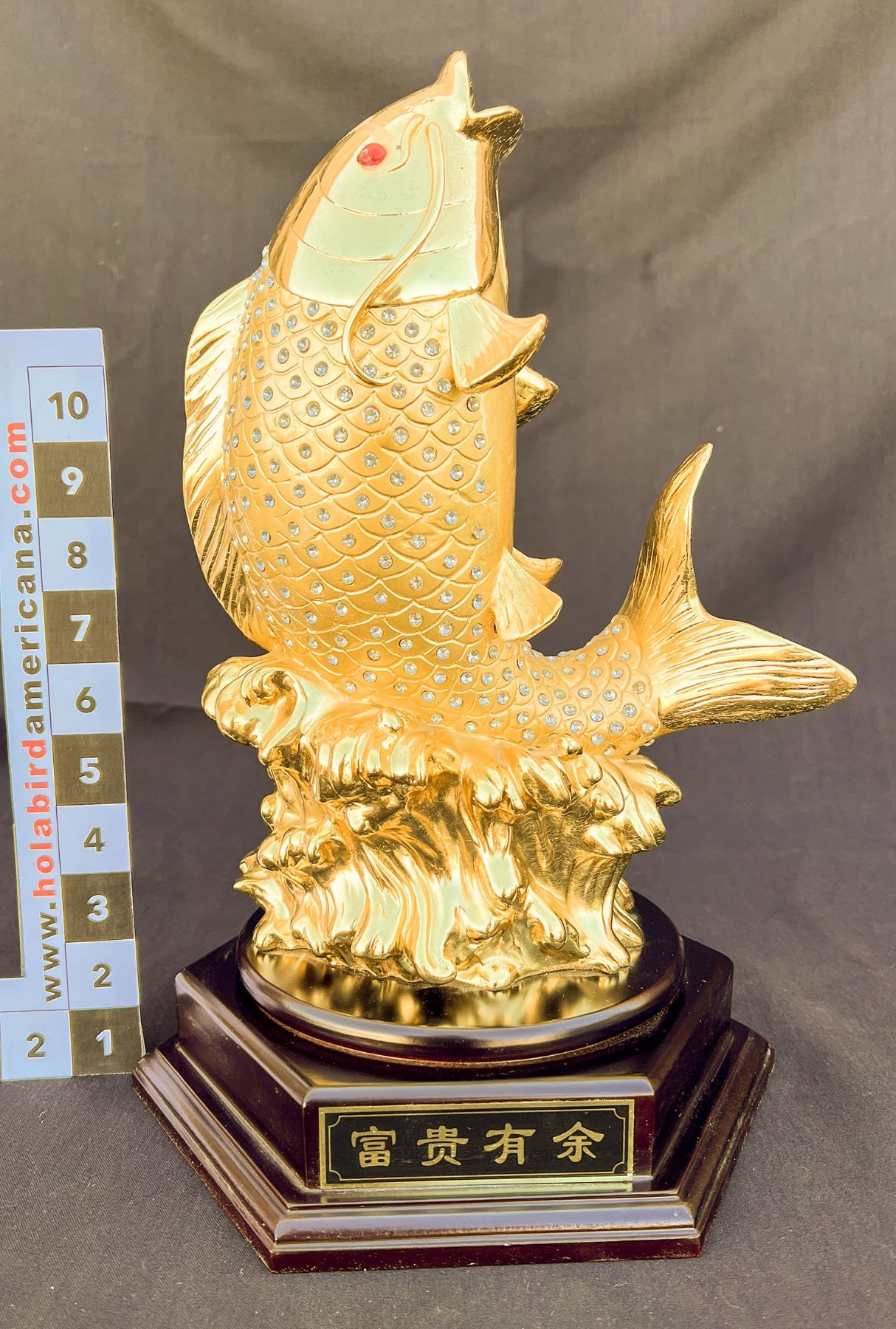 This shining golden-toned jumping fish with jeweled scale is a presentation trophy to recognize "Wealth and Honor" of the recipient. The fish is a token of good luck and fortune, and this is a beautiful way to celebrate that in a special person. One red eye is missing on the back side. the trophy comes in a beautiful presentation box with golden yellow lining (that could use a few stitches for minor repair). See photo for relative size. This is an impressive gift for someone well-deserving of recognition. China Chunlin Zhu Collection